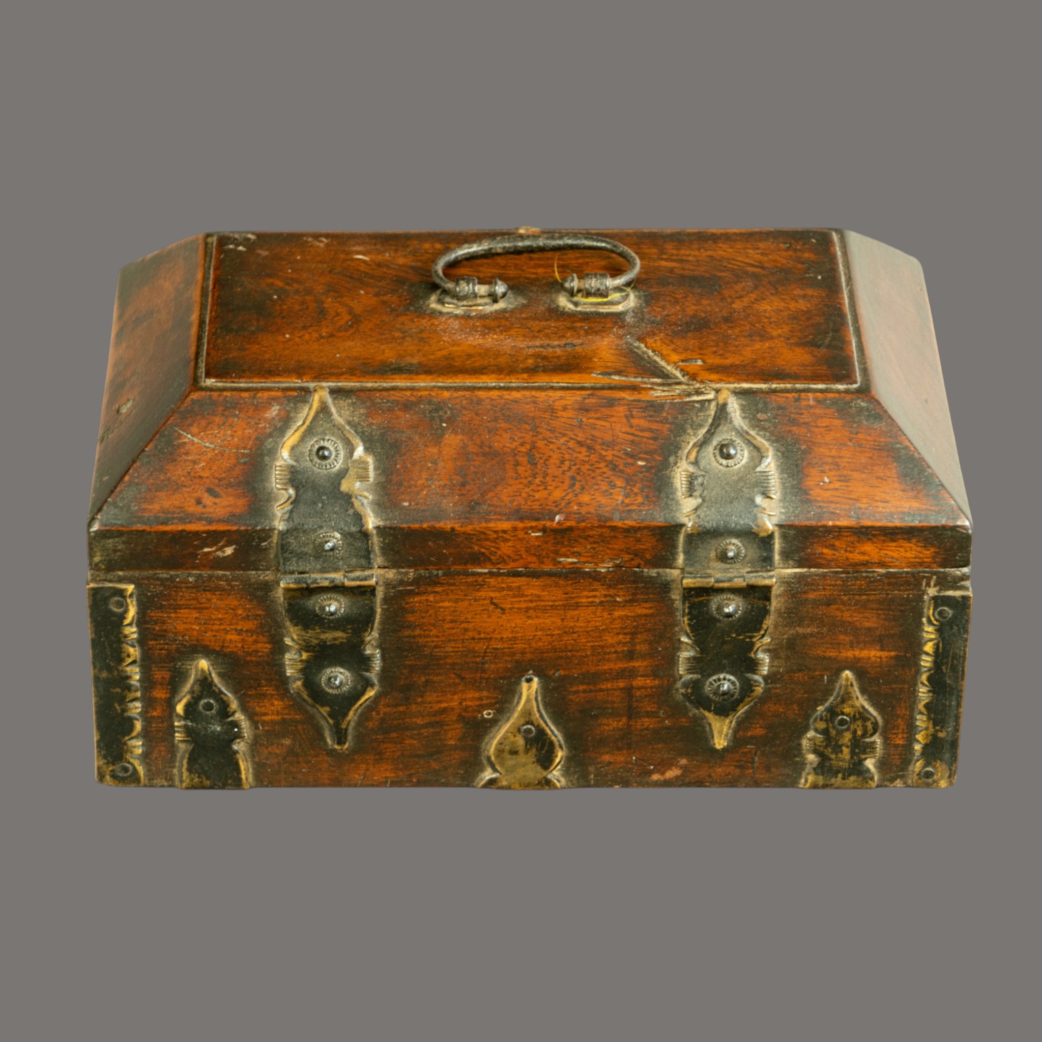 A rare and attractive nineteenth-century teakwood box originating from South India, finely constructed from richly grained hardwood and fitted with decorative brass and iron mounts. The box is crafted from solid teakwood with a gently domed lid and sloping sides, reflecting the traditional form of travelling document or jewellery caskets produced by skilled South Indian craftsmen during the colonial period.