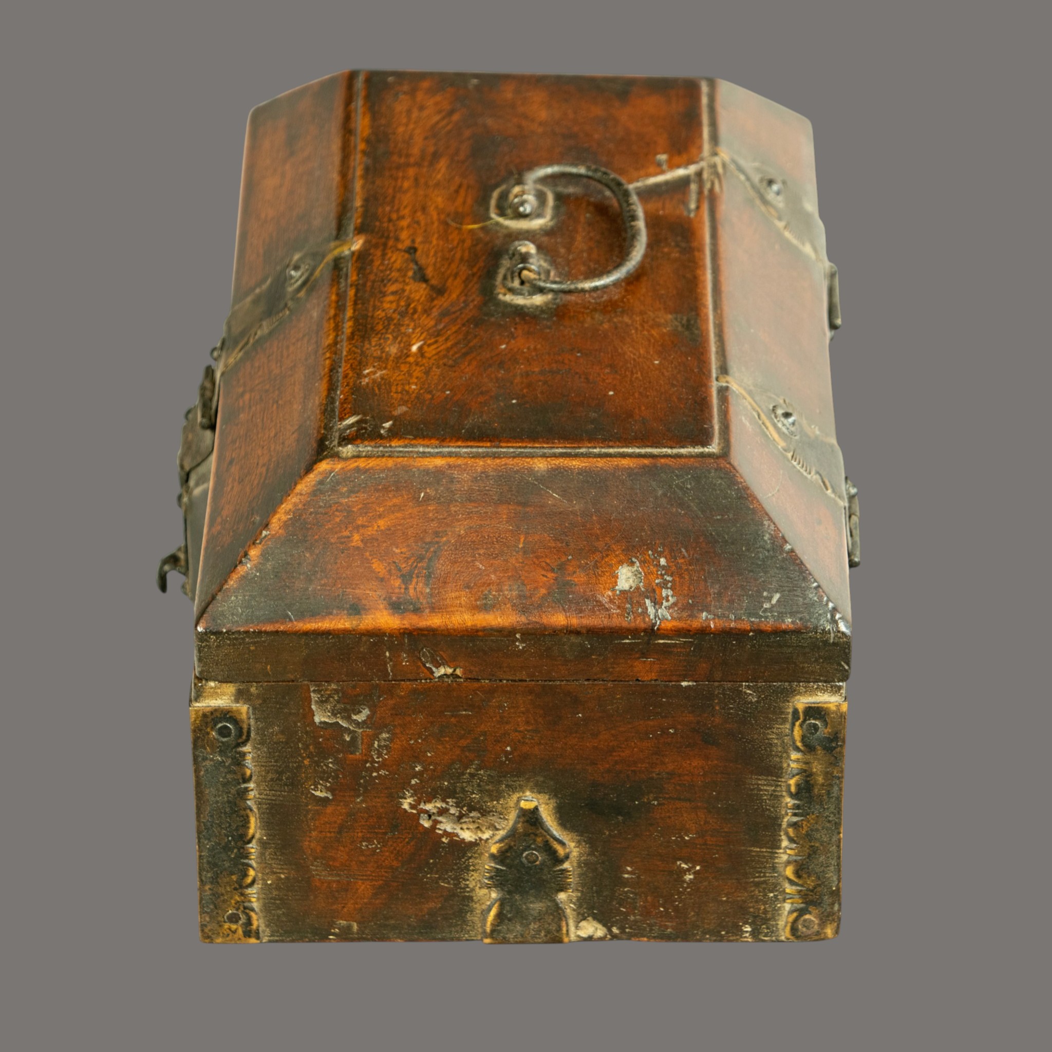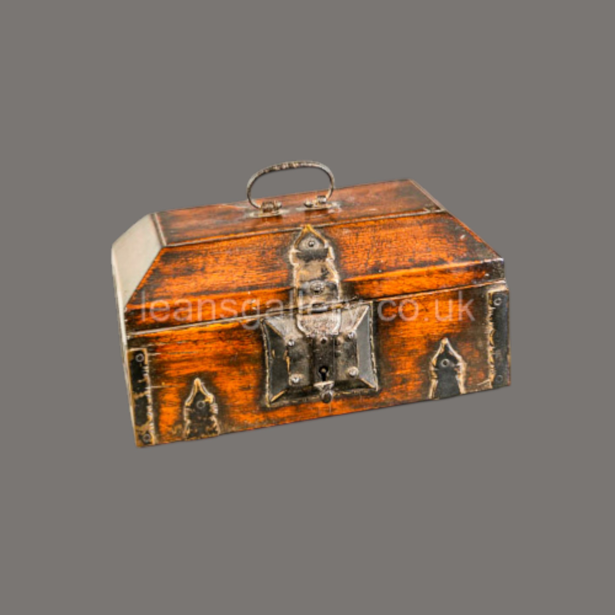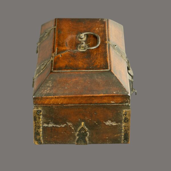 The exterior retains a deep warm patina developed through age and use, highlighting the natural grain and colour of the teak. The box is strengthened with hand-worked brass mounts and iron hinges, while the front is fitted with an original brass lock plate and clasp. The sturdy carrying handle on the lid suggests it was designed as a portable valuables or document box, often used for jewellery, coins, or important papers.