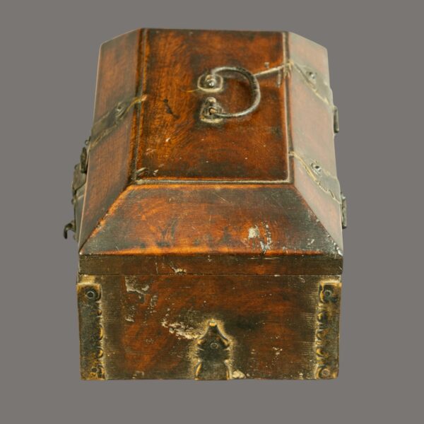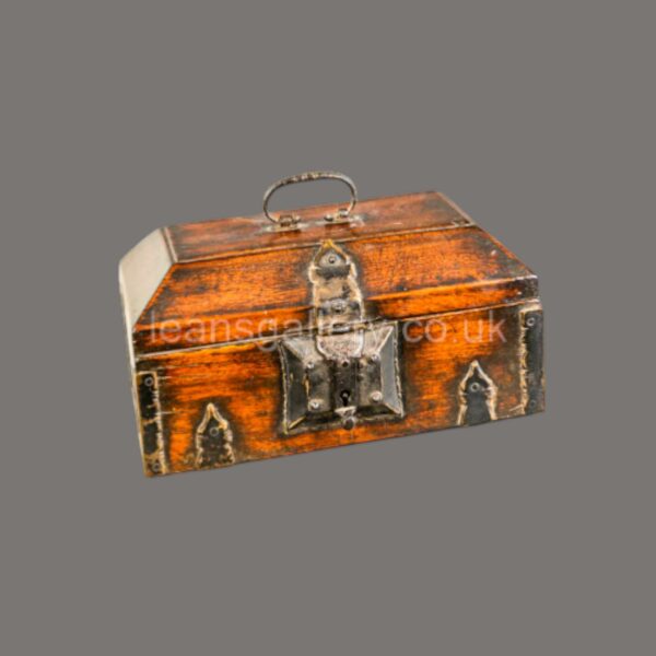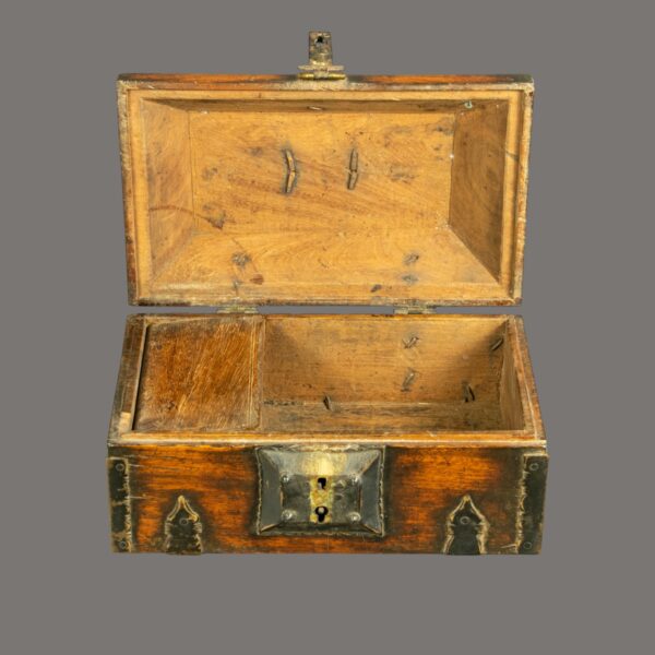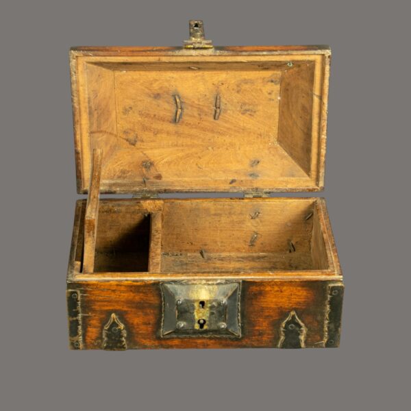 Inside, the box retains a small original partition at the base, further suggesting its use for organising valuables or personal items. The honest wear, surface marks, and mellow patina throughout are consistent with age and contribute to its authentic antique character. Such boxes were valued for their durability and were widely used in India during the nineteenth century by merchants and households alike.