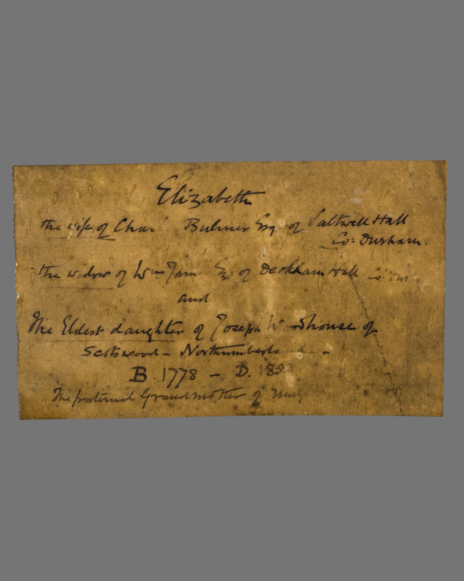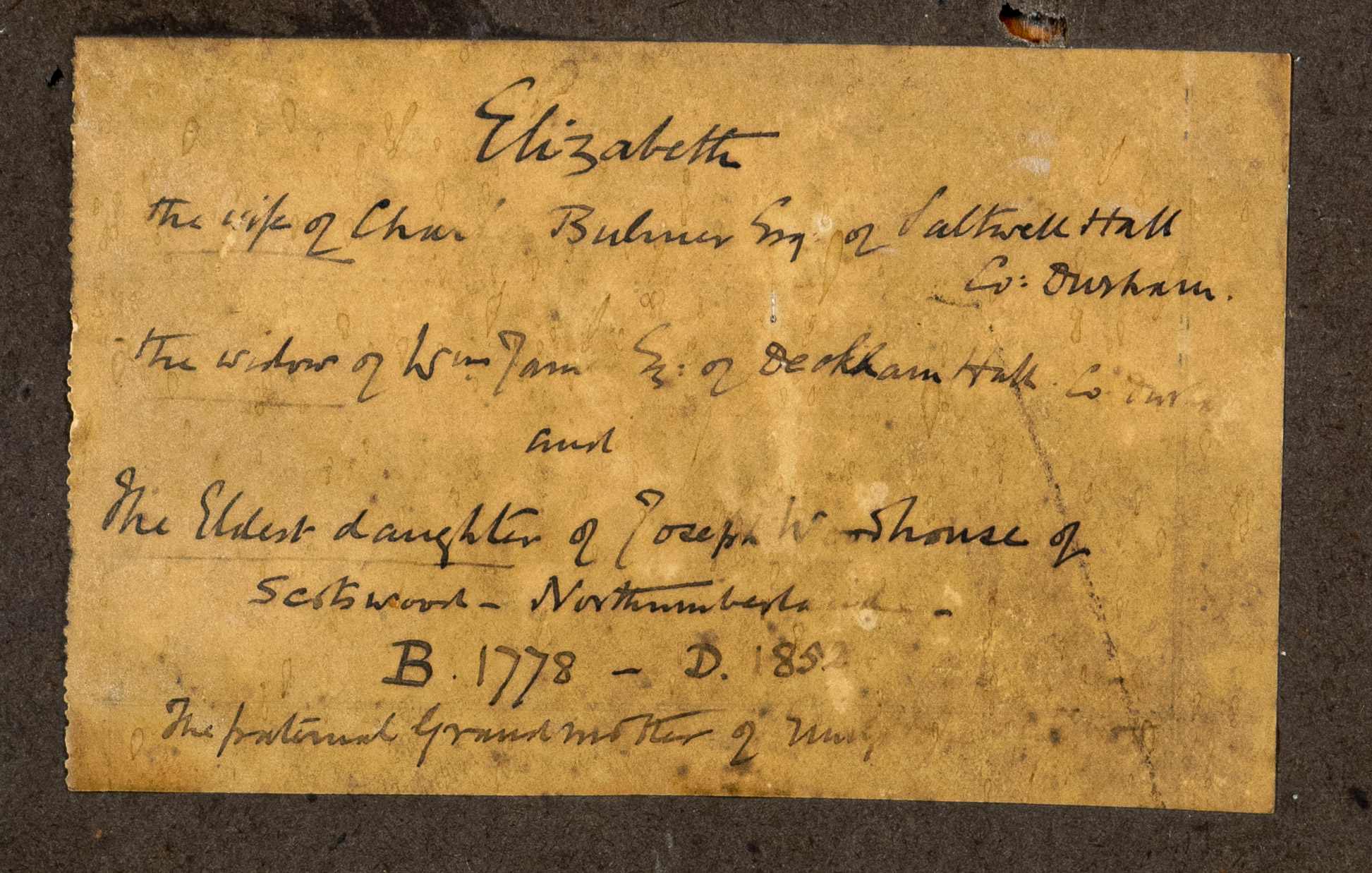 She is the eldest daughter of Joseph Woodhouse of Southwood, Northumberland—more indistinct description at verso.