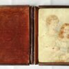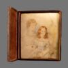 Presented in its original period hinged case with velvet lining, in the manner of daguerreotype and ambrotype photographic portraits. While frequently mistaken for early photographic processes, this example is a painted ceramic miniature rather than a daguerreotype.
