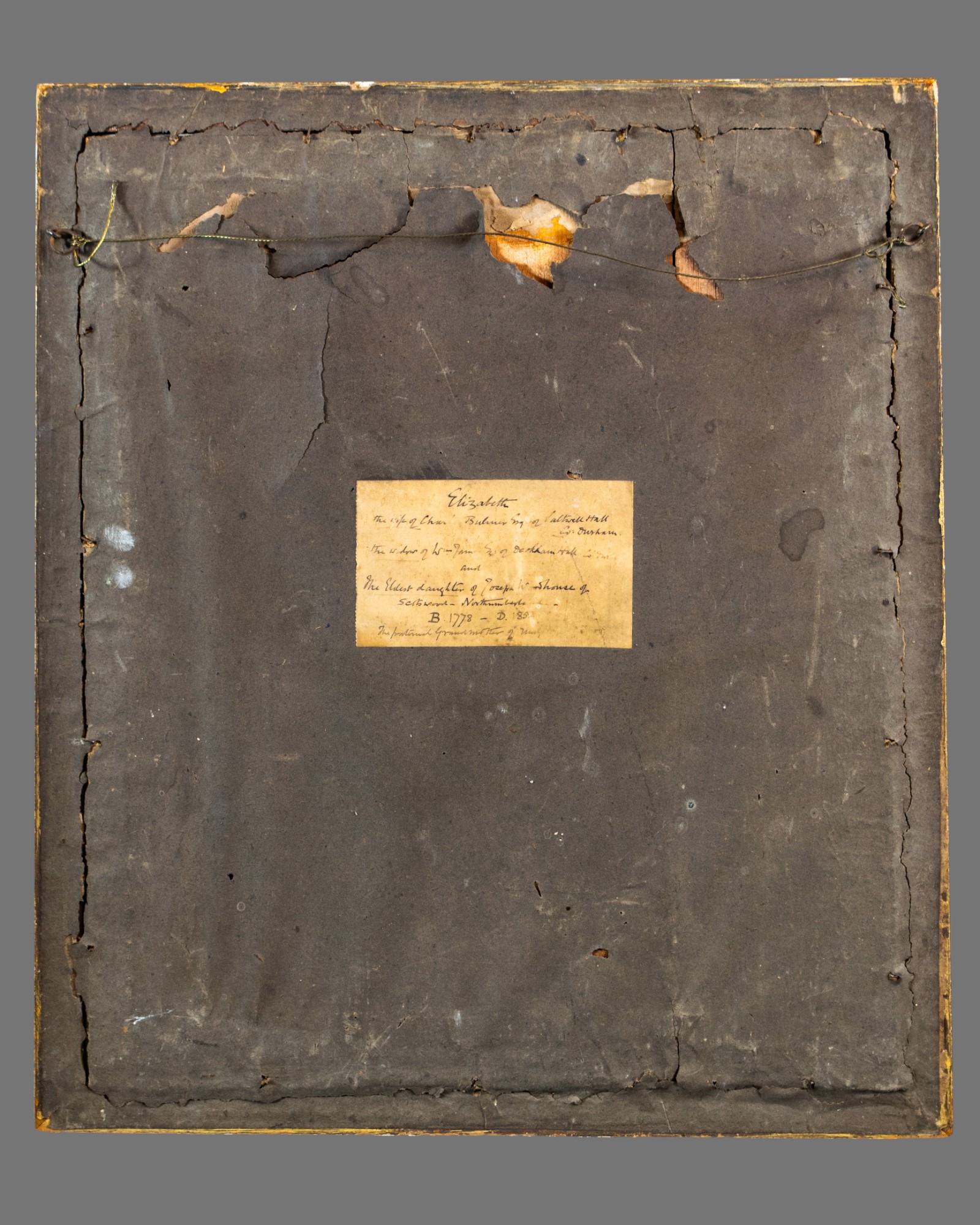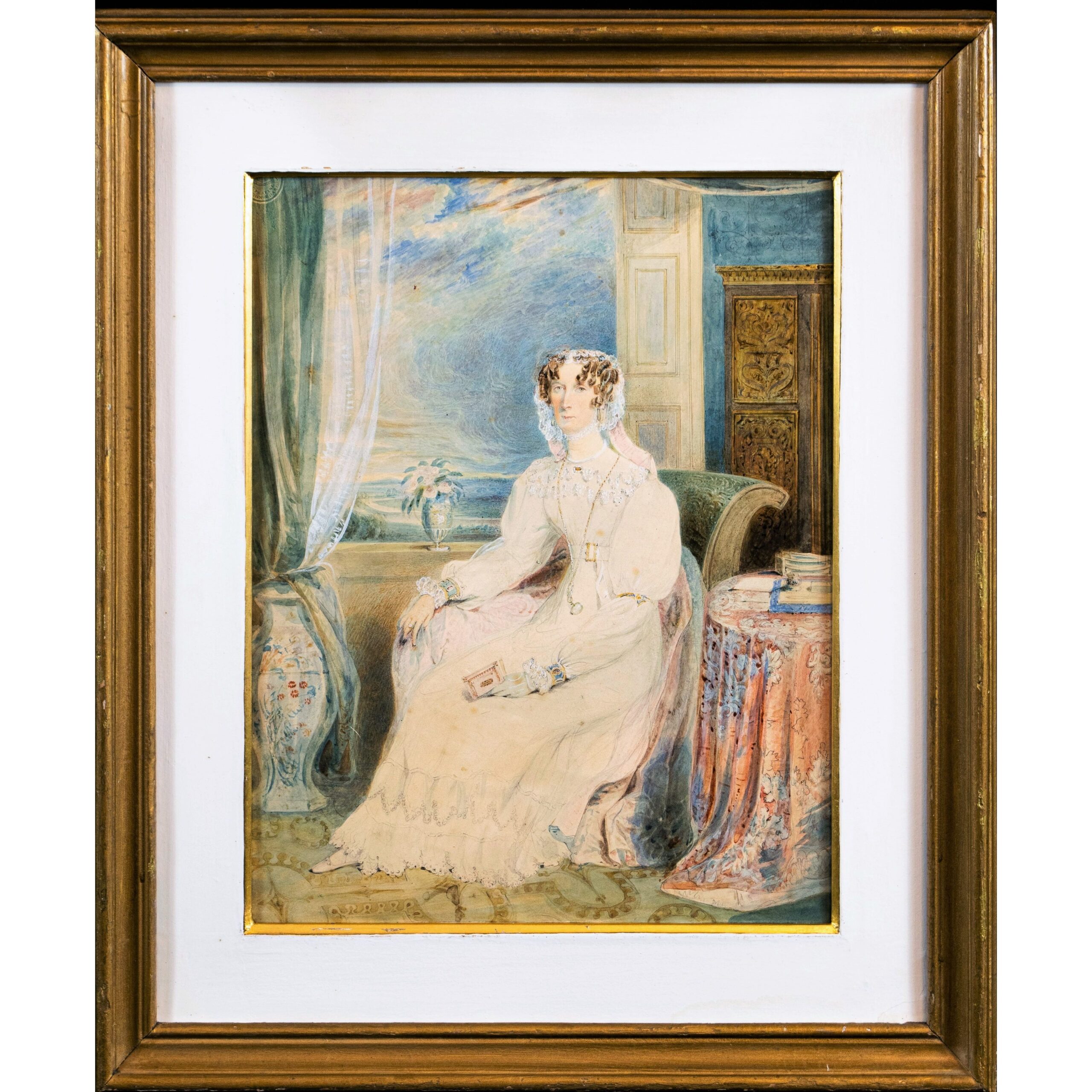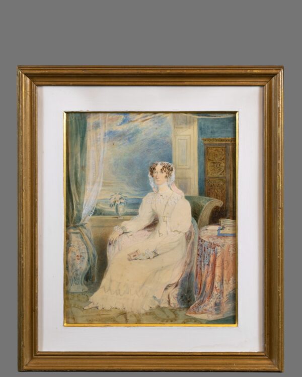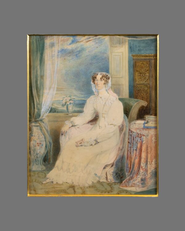 This rare and beautifully executed 19th-century watercolour portrait depicts Lady Elizabeth, wife of Charles Bulmer Esq. of Saltwell Hall, County Durham. Born in 1778, Lady Elizabeth was the eldest daughter of Joseph Woodhouse of Southwood, Northumberland, and is portrayed here with remarkable elegance and refinement.