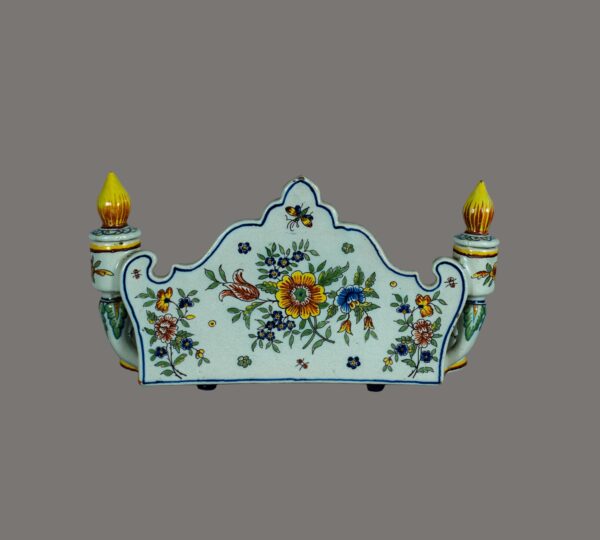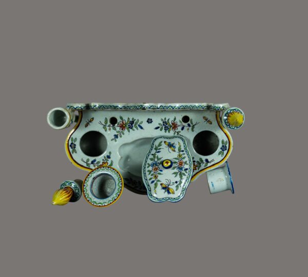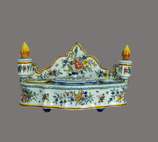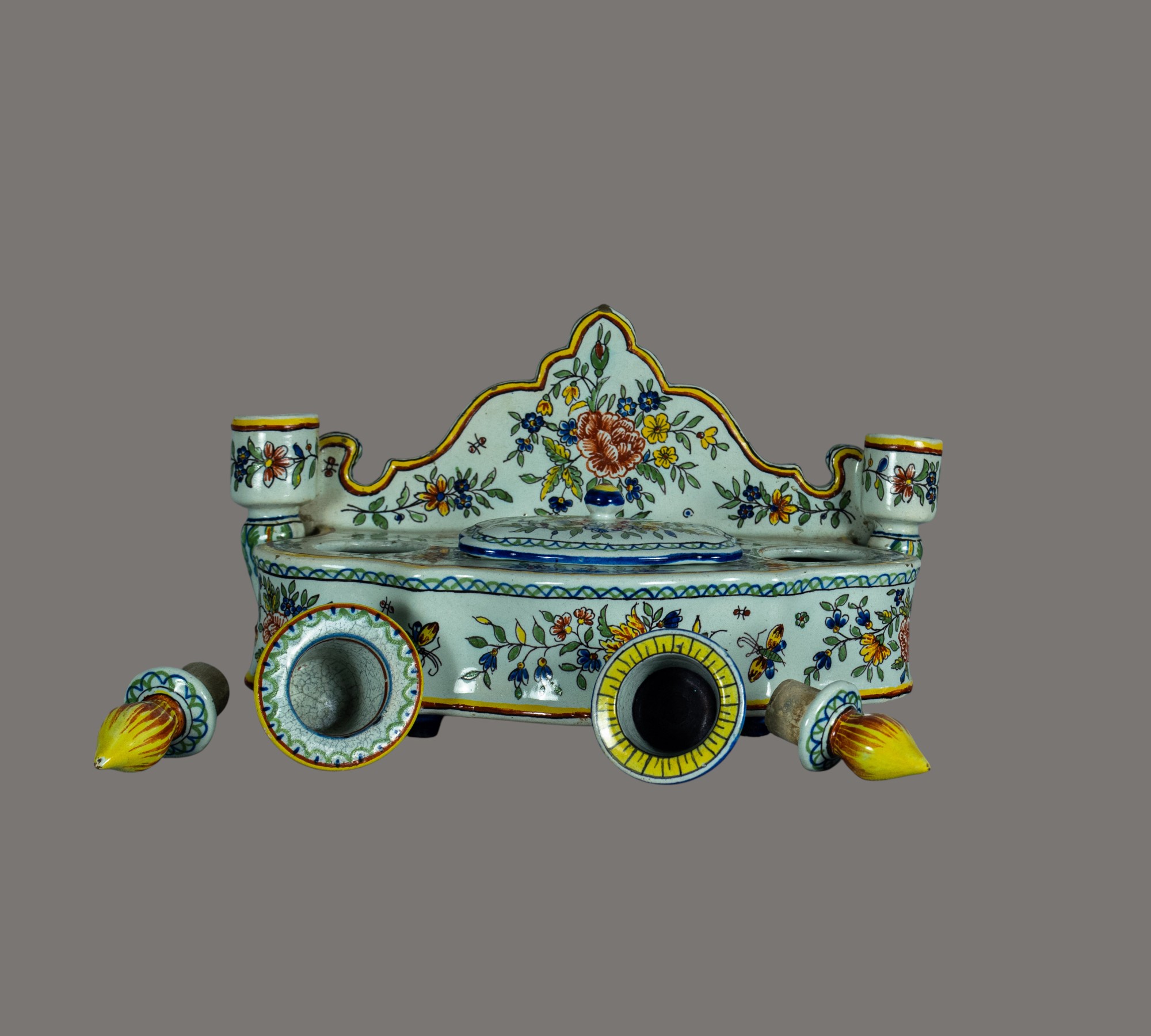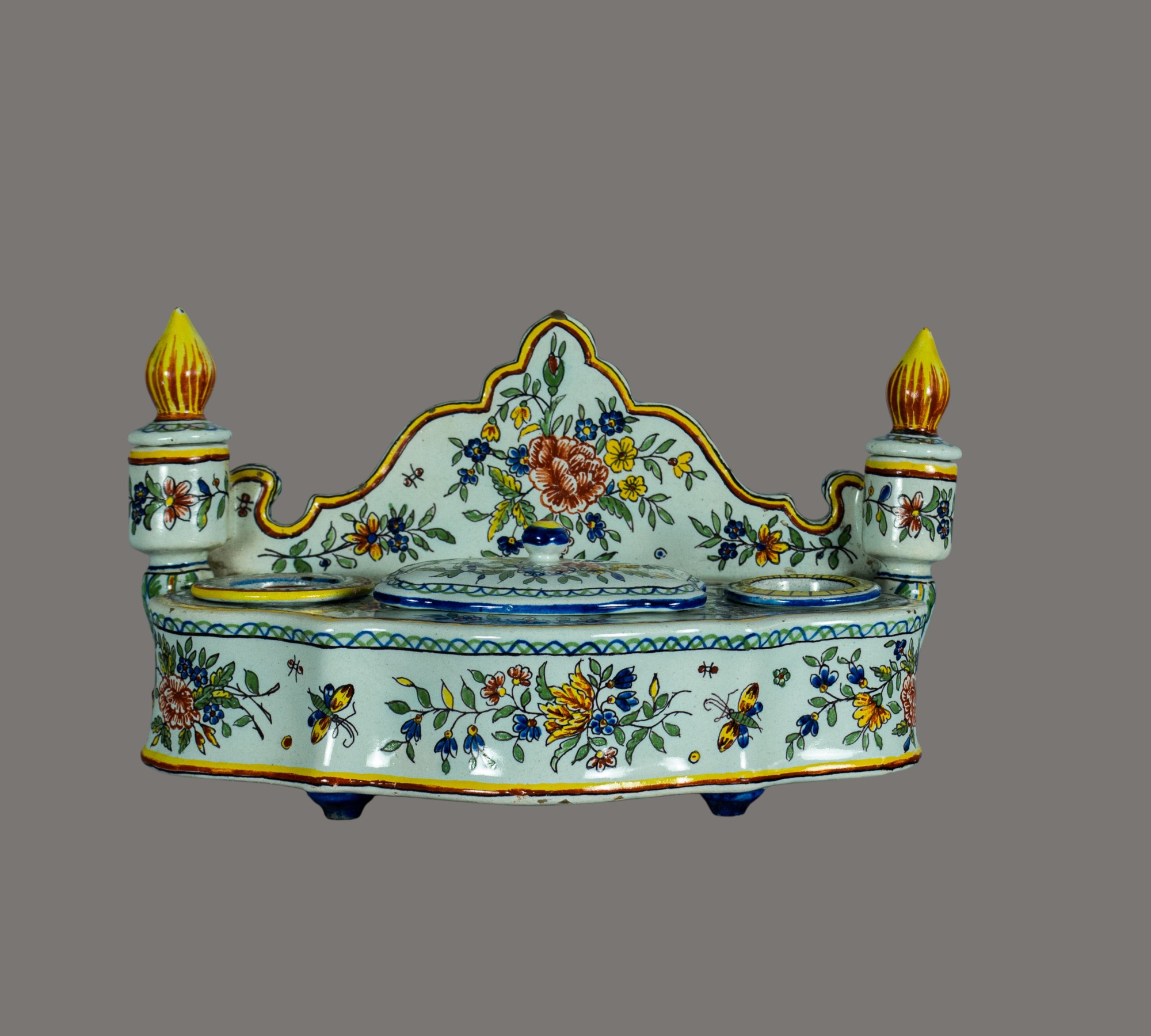 A charming French Continental faience double inkwell, probably from the Rouen region, decorated with polychrome floral sprays and insects in blue, yellow, green, and iron-red enamels. The central hinged cover is flanked by two inkwells surmounted by flame-shaped finials, all raised on small feet. The arched back panel is richly painted with flowers and scrolling foliage, displaying the lively palette and painterly character associated with Rouen faience. Minor wear consistent with age, contributing to its authentic character. From a private collection.