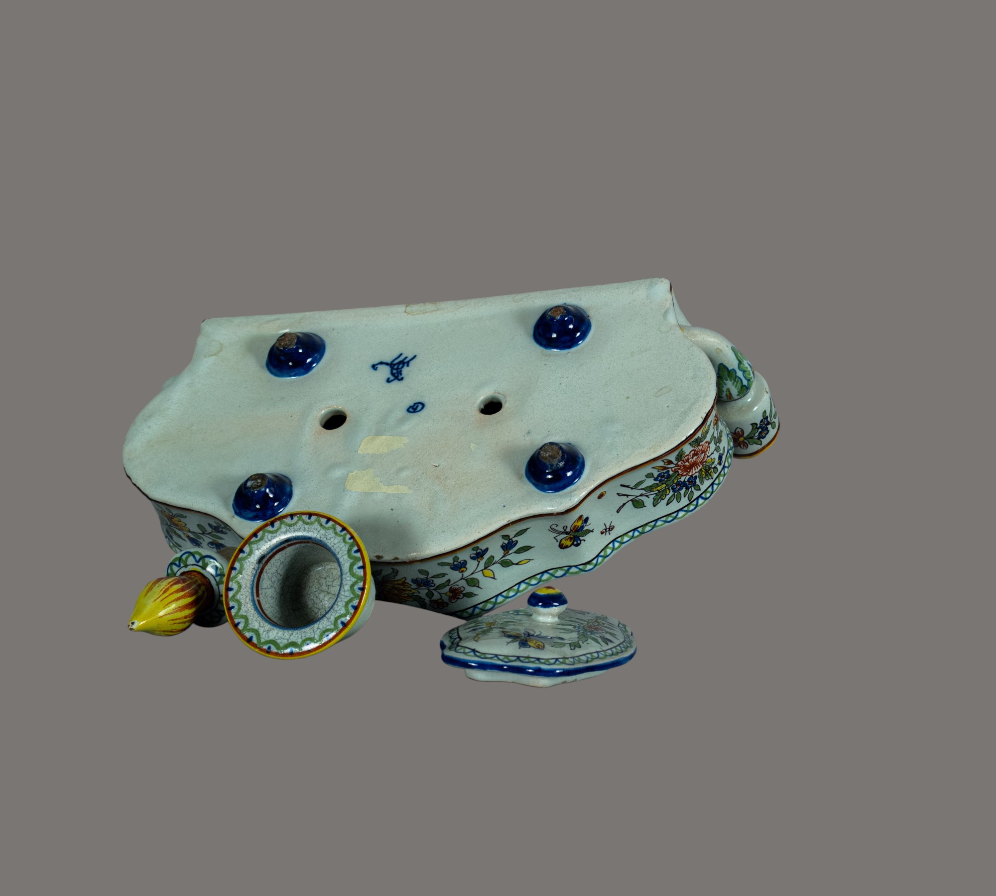 A charming French Continental faience double inkwell, probably from the Rouen region, decorated with polychrome floral sprays and insects in blue, yellow, green, and iron-red enamels. The central hinged cover is flanked by two inkwells surmounted by flame-shaped finials, all raised on small feet.