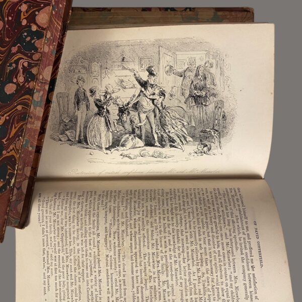 Beautifully bound collection featuring Nicholas Nickleby, Martin Chuzzlewit, David Copperfield, and The Pickwick Papers with gilt-decorated spines and marbled edges. Published by Chapman & Hall, London. A timeless addition to any rare book collection!