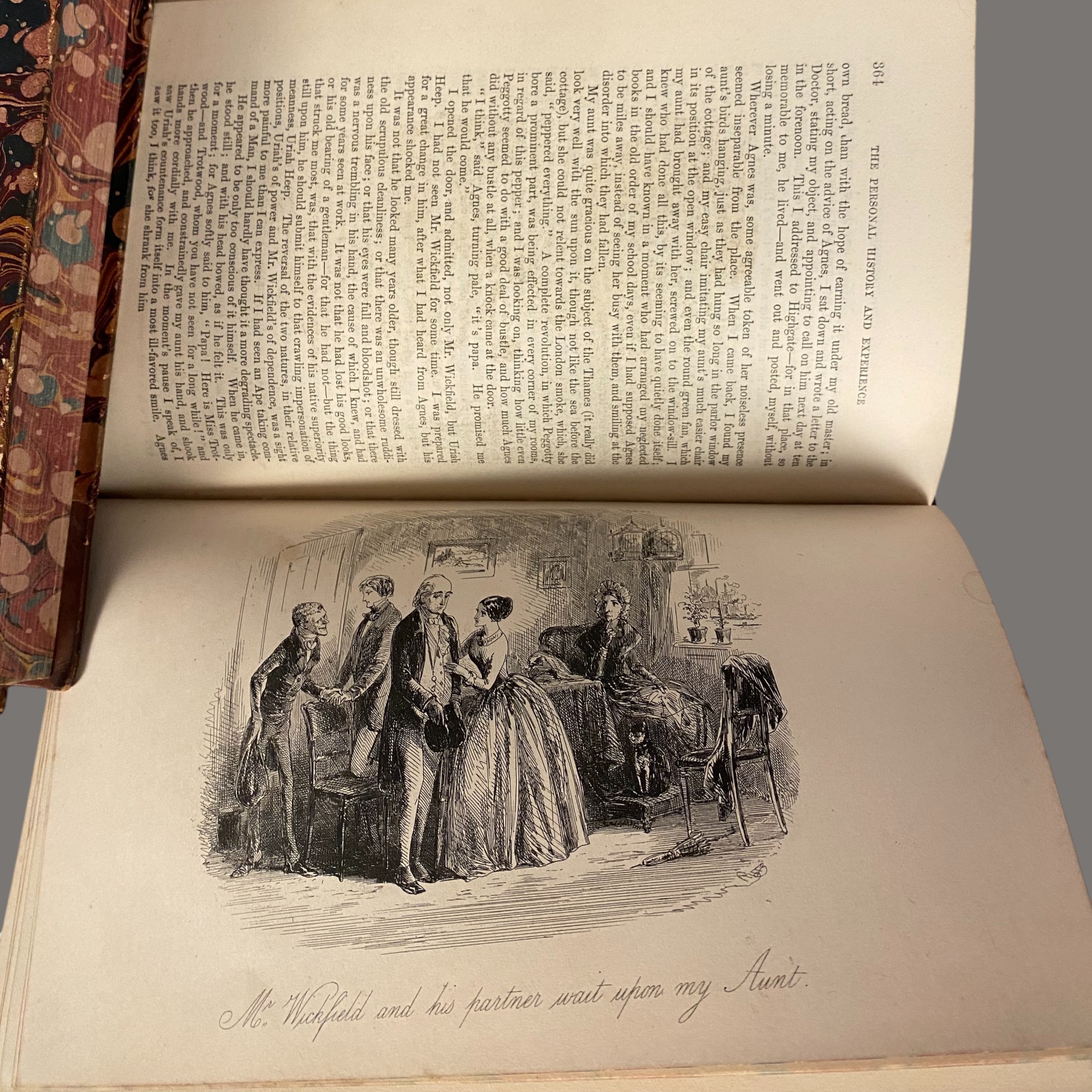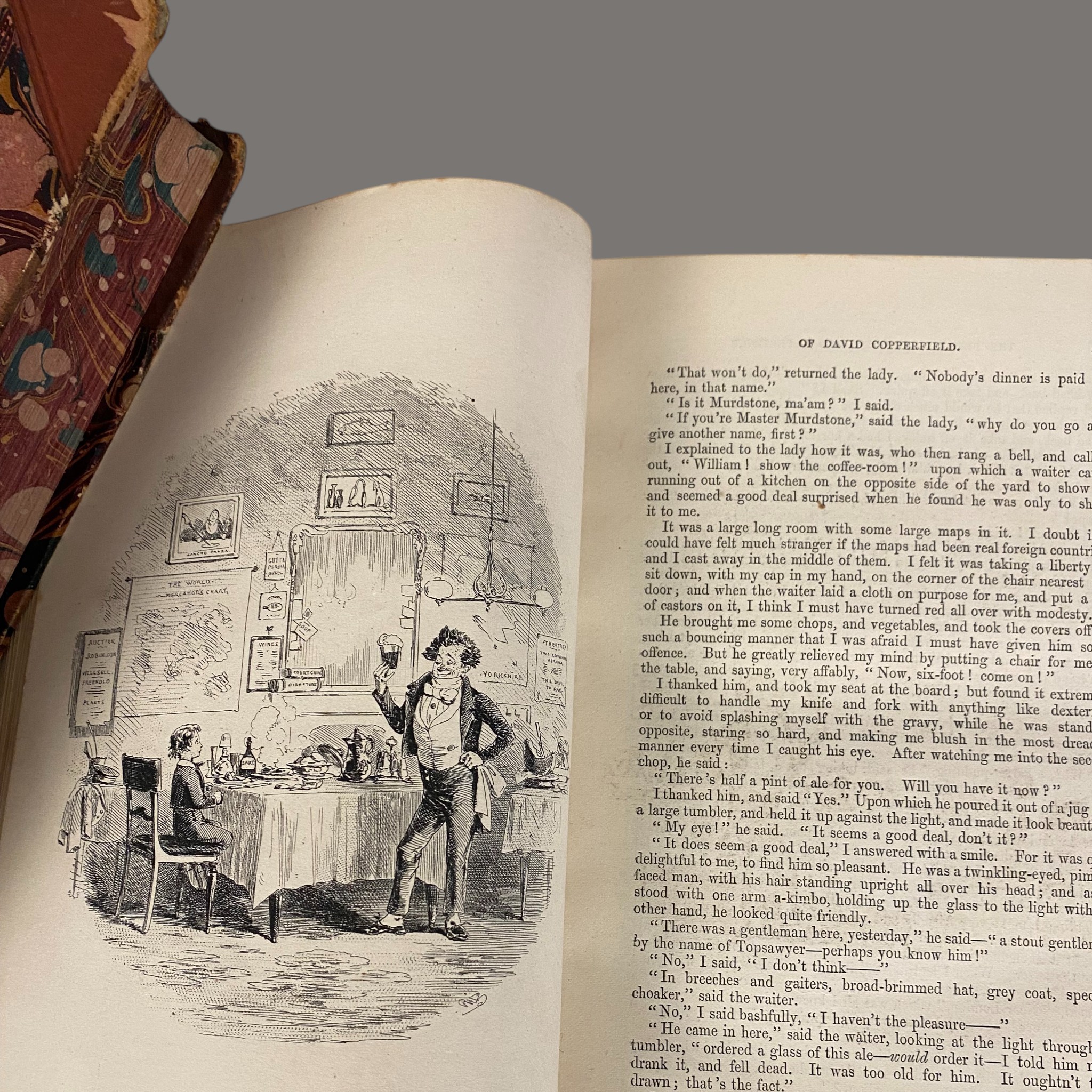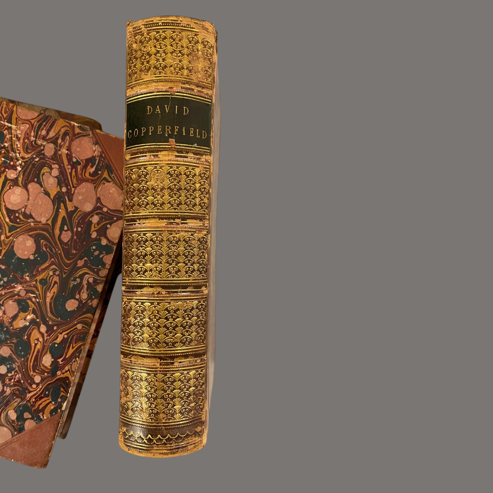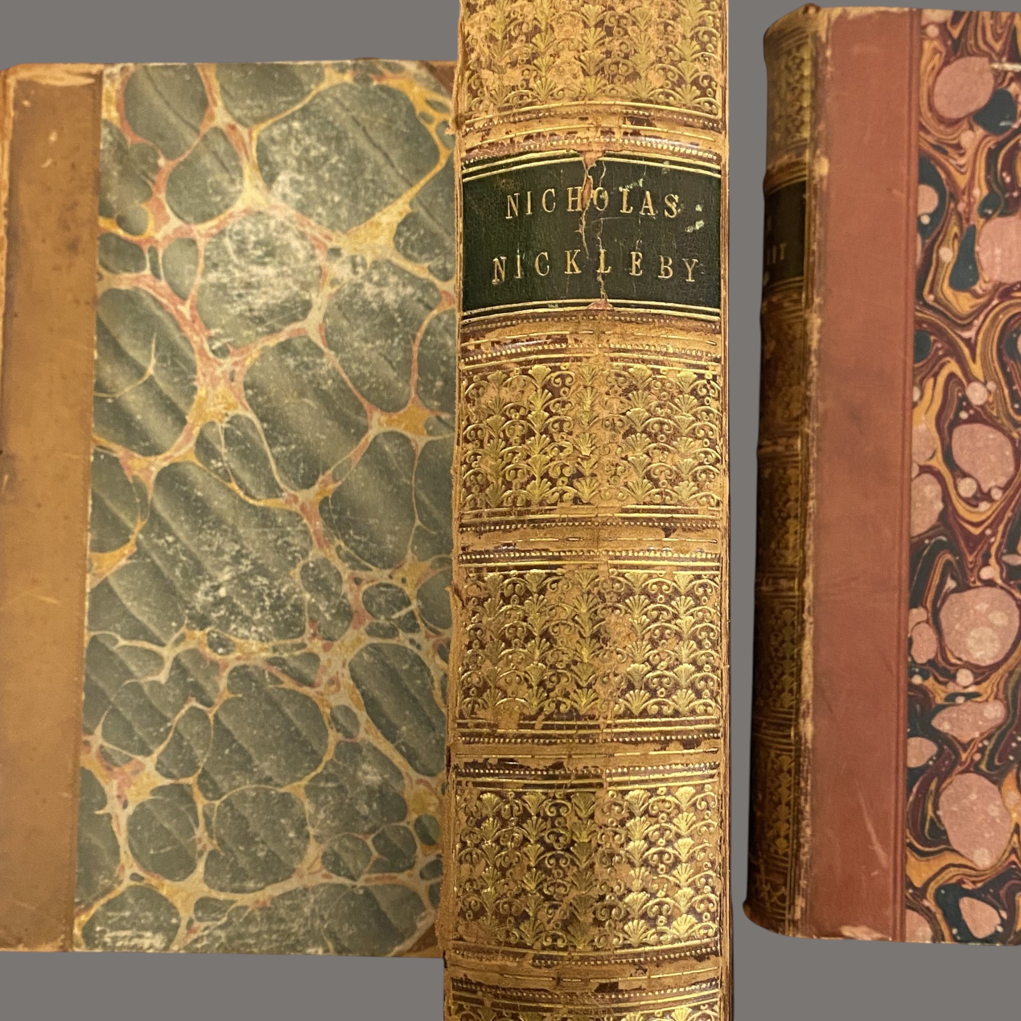 Beautifully bound collection featuring Nicholas Nickleby, Martin Chuzzlewit, David Copperfield, and The Pickwick Papers with gilt-decorated spines and marbled edges. Published by Chapman & Hall, London. A timeless addition to any rare book collection!