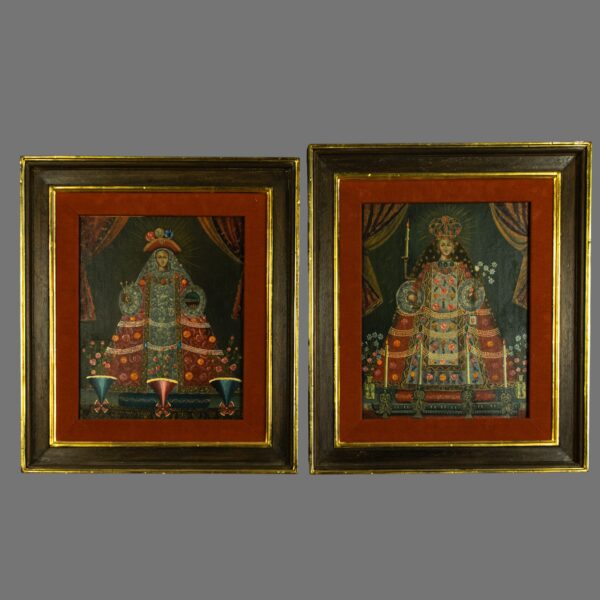 This striking Cuzco School oil painting on board depicts the Madonna in the richly decorative sacred style associated with colonial Peruvian art. Dating to the late 19th to early 20th century, the work reflects the enduring influence of the Cusco School tradition, renowned for its fusion of European iconography with indigenous Andean symbolism.