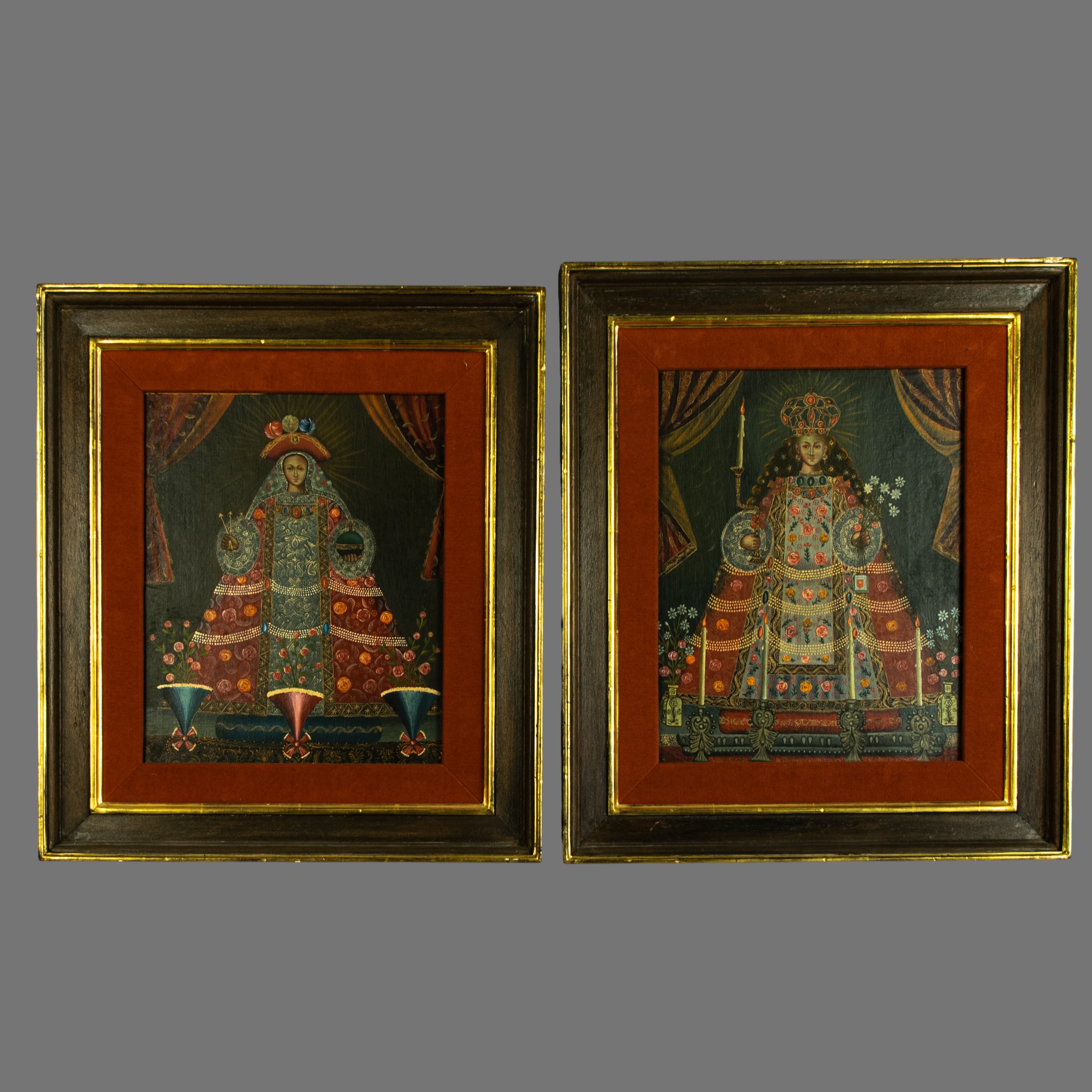 The Virgin is shown crowned and haloed, standing beneath theatrical drapery that frames the composition and reinforces its ceremonial character. She holds symbolic objects associated with Marian devotion, including a lit candle and floral elements, while her richly patterned garments are adorned with jewel-like detailing and stylised floral motifs. The symmetrical composition, flattened perspective, and emphasis on surface decoration are hallmarks of Cusco School painting, privileging spiritual presence and authority over naturalistic realism.