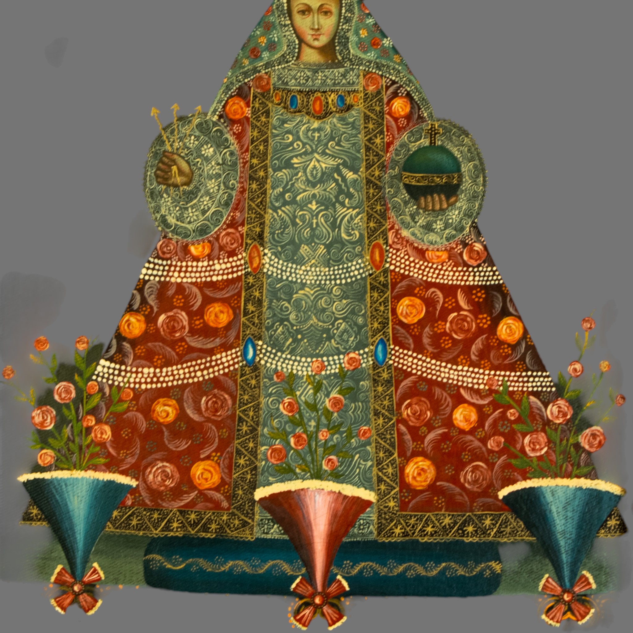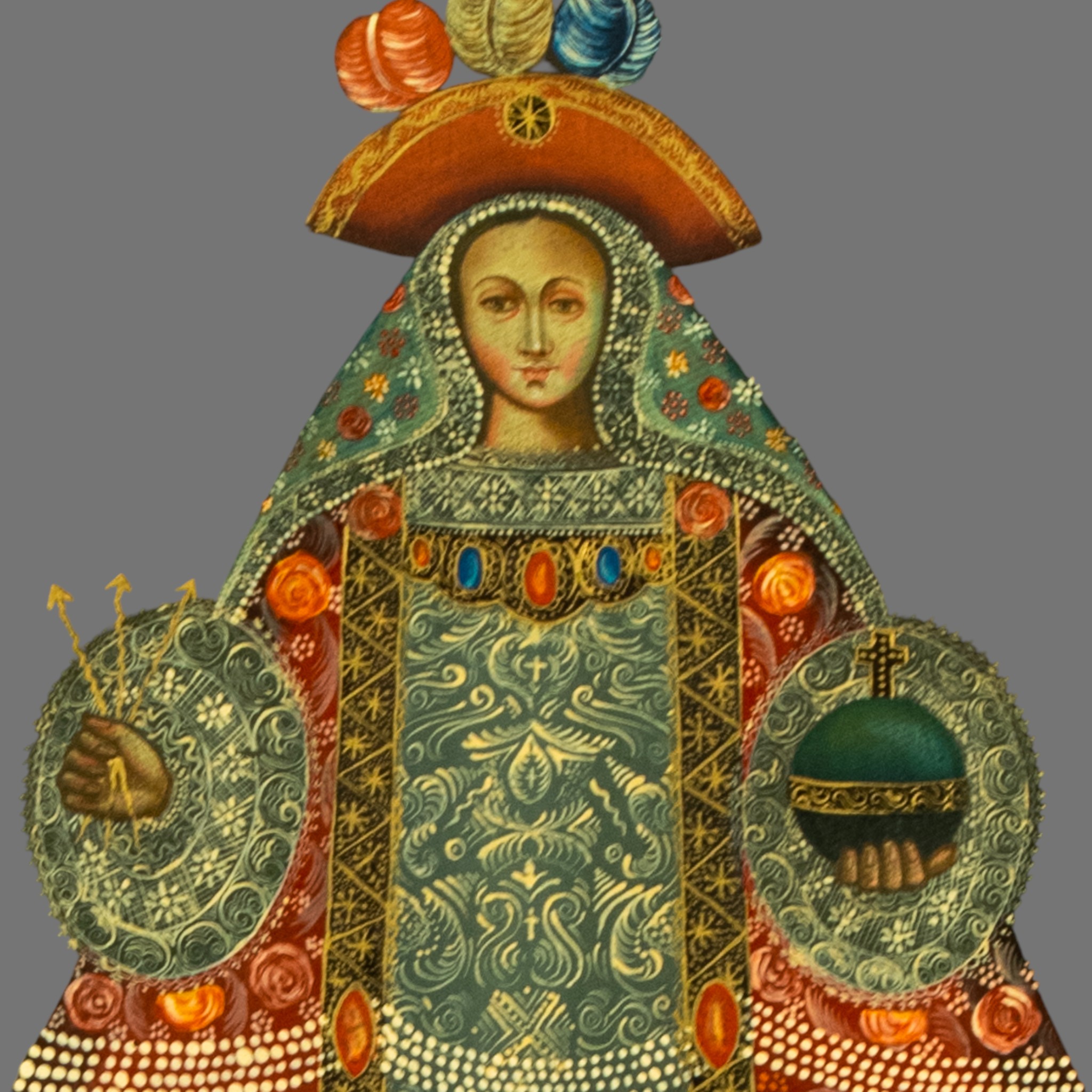 Notably, the Infant Christ is absent from this composition. Instead, Mary is presented as a standalone sacred figure, a format commonly associated with Marian devotions such as Our Lady of Light, Our Lady of the Rosary, or related cult images popular throughout colonial and post-colonial Latin America.