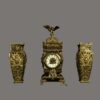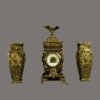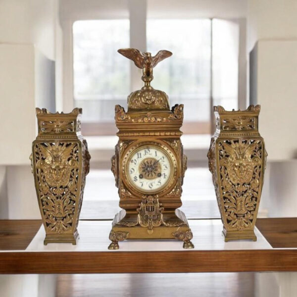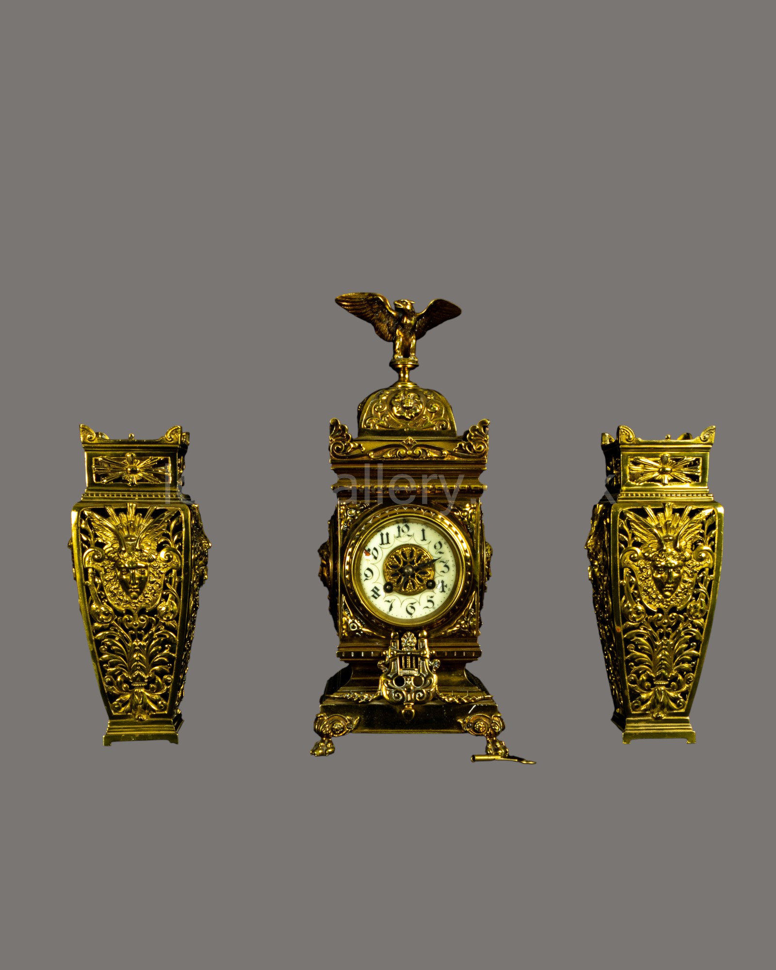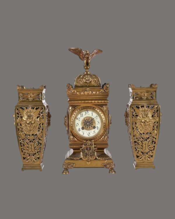 Impressive late 19th-century French lacquered brass mantel clock set by the renowned Paris maker Samuel Marti. This elegant three-piece garniture includes the clock and a matching pair of urn-shaped side pieces, all richly cast in a classical style with fine decorative detail.