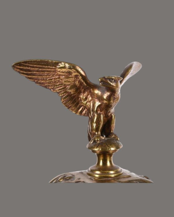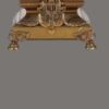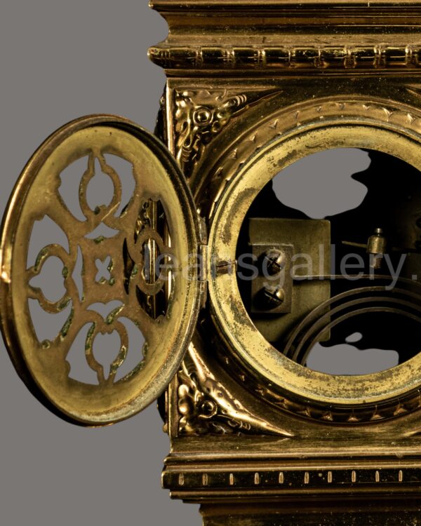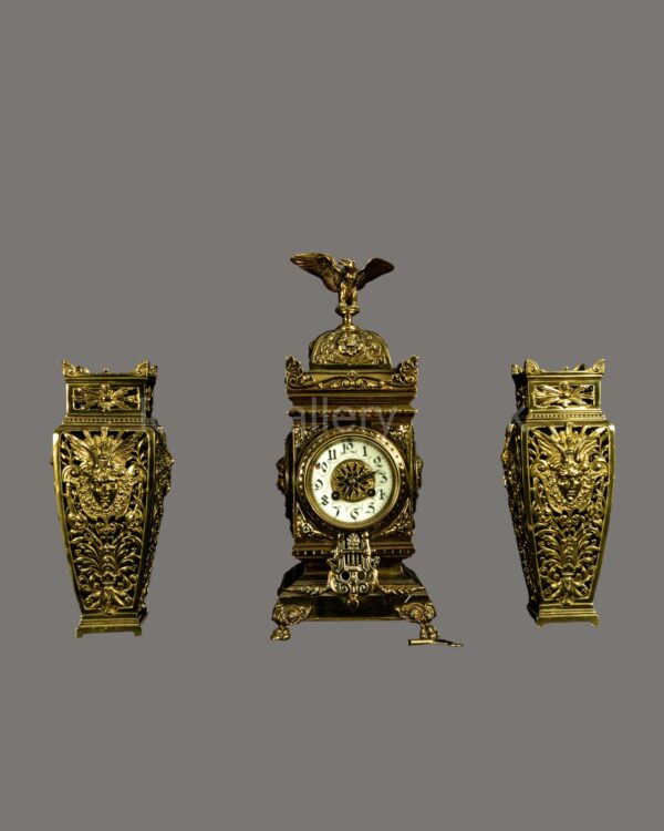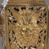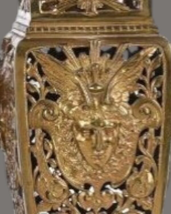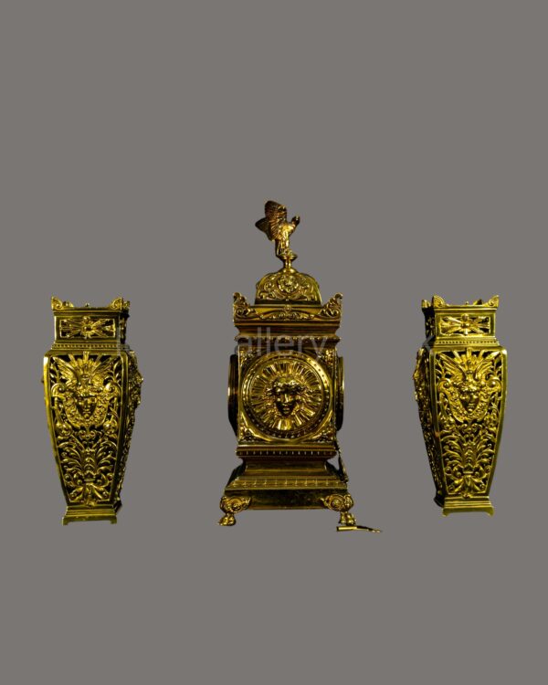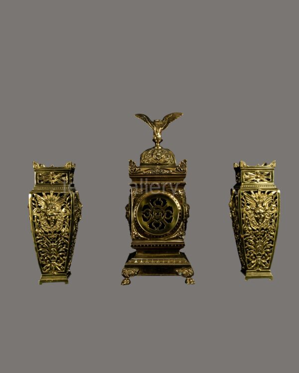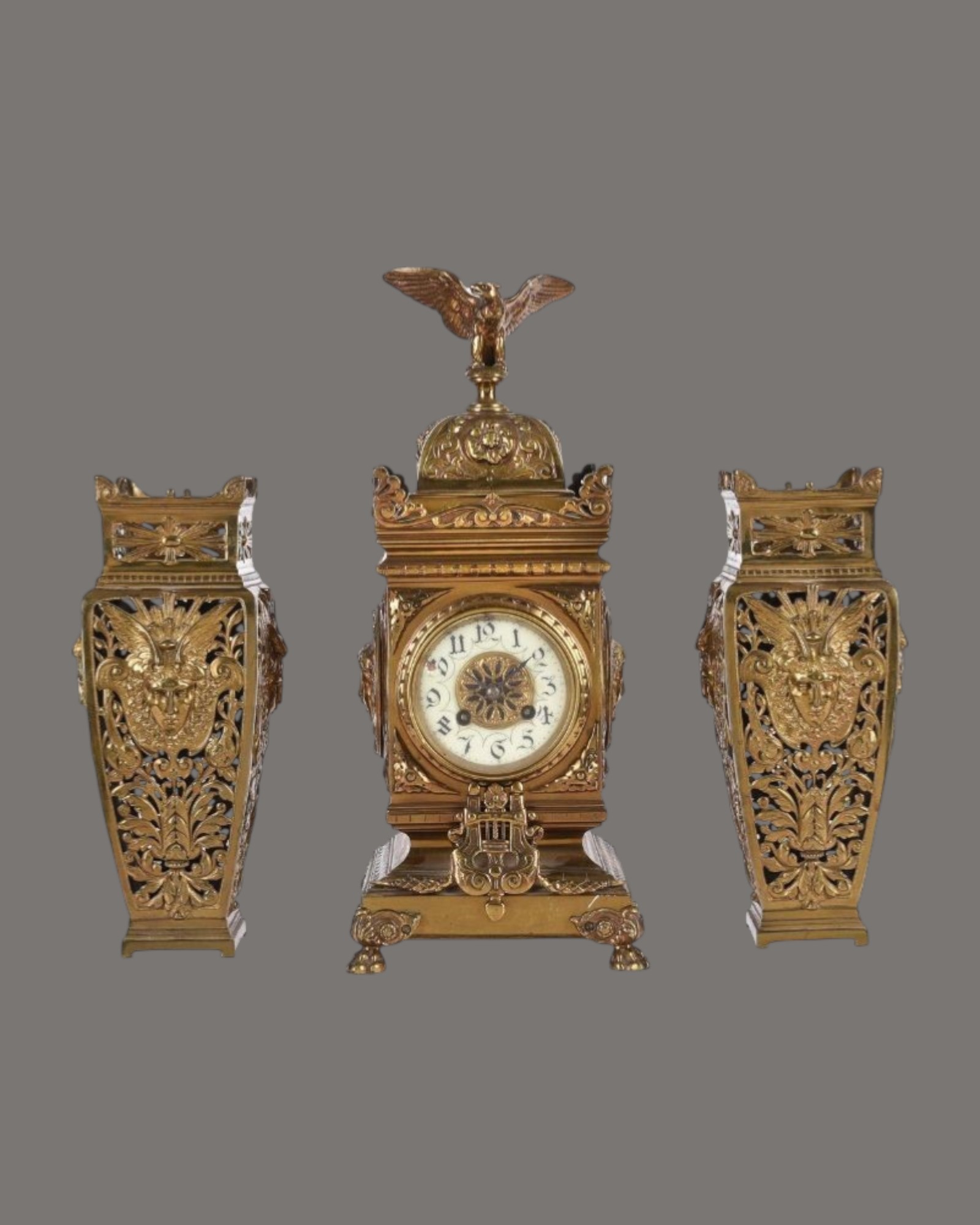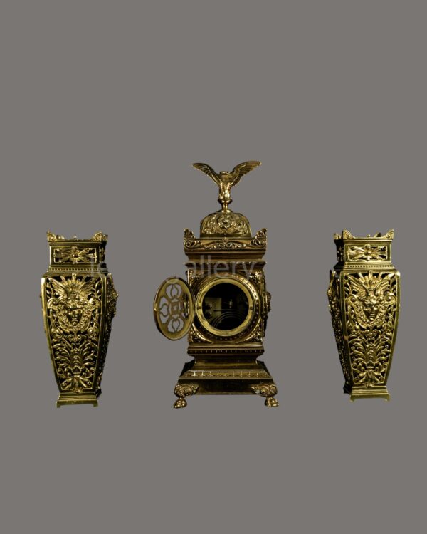 The case is surmounted by an eagle above a domed top with foliate decoration, female mask mounts to the sides, and a lyre mount to the base, raised on lion’s paw feet. The matching urn garnitures are decorated with starburst panels and masks of Hermes within pierced scrollwork.