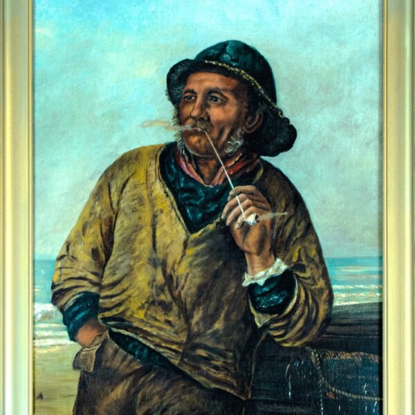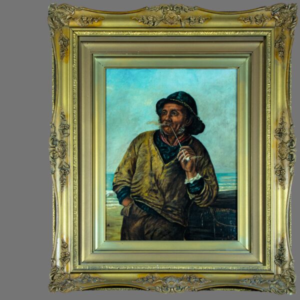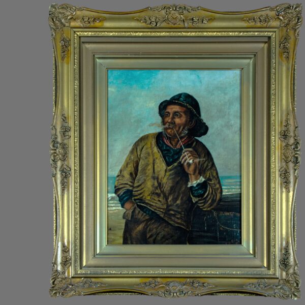 Executed in oil on canvas, the artist employs warm earth tones and confident brushwork to convey both character and atmosphere, with particular attention paid to the sitter’s expressive features and textured clothing. The subject matter reflects the strong popular interest in seafaring life at the turn of the 20th century, when coastal scenes and working-class maritime portraits were widely exhibited and collected in Britain.