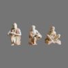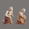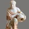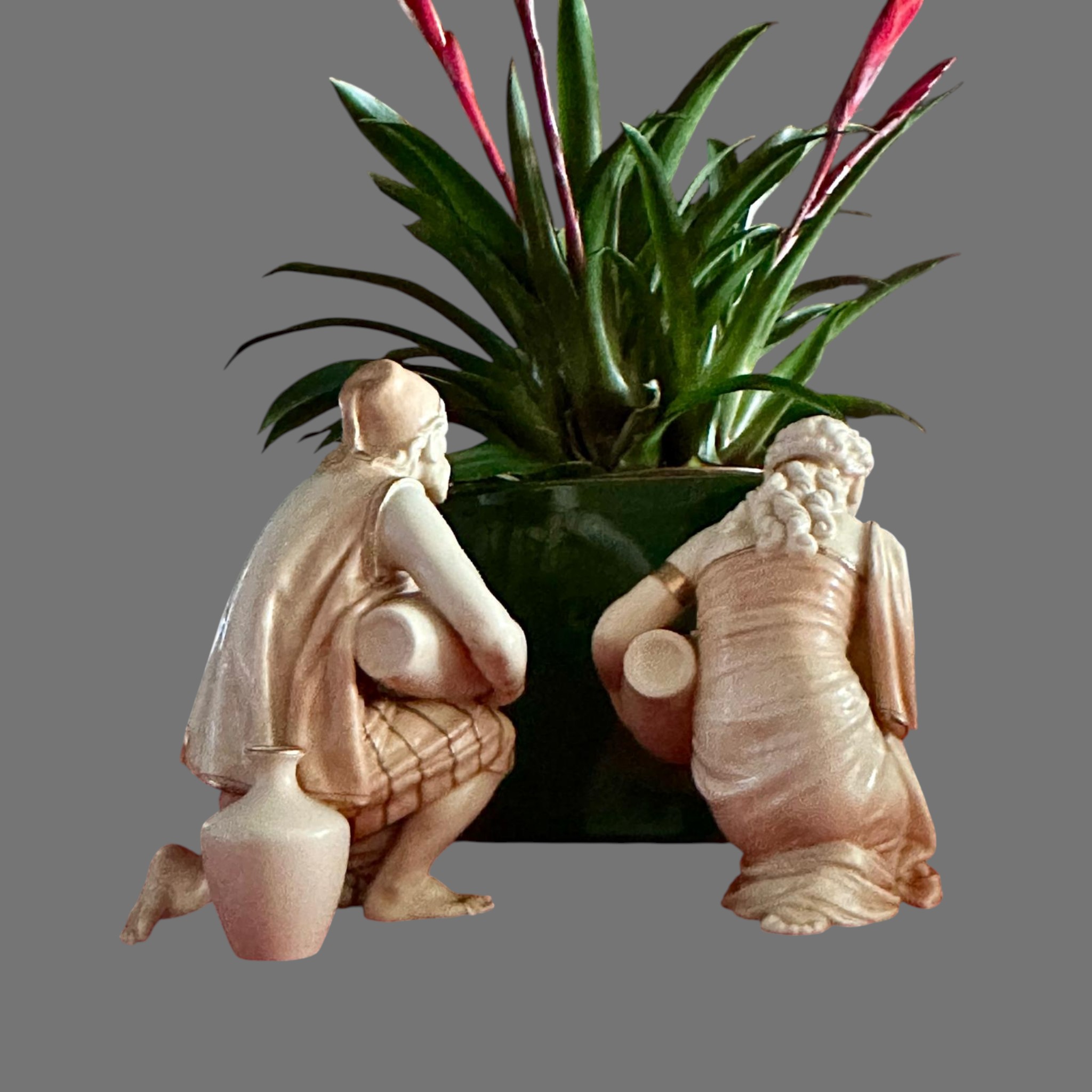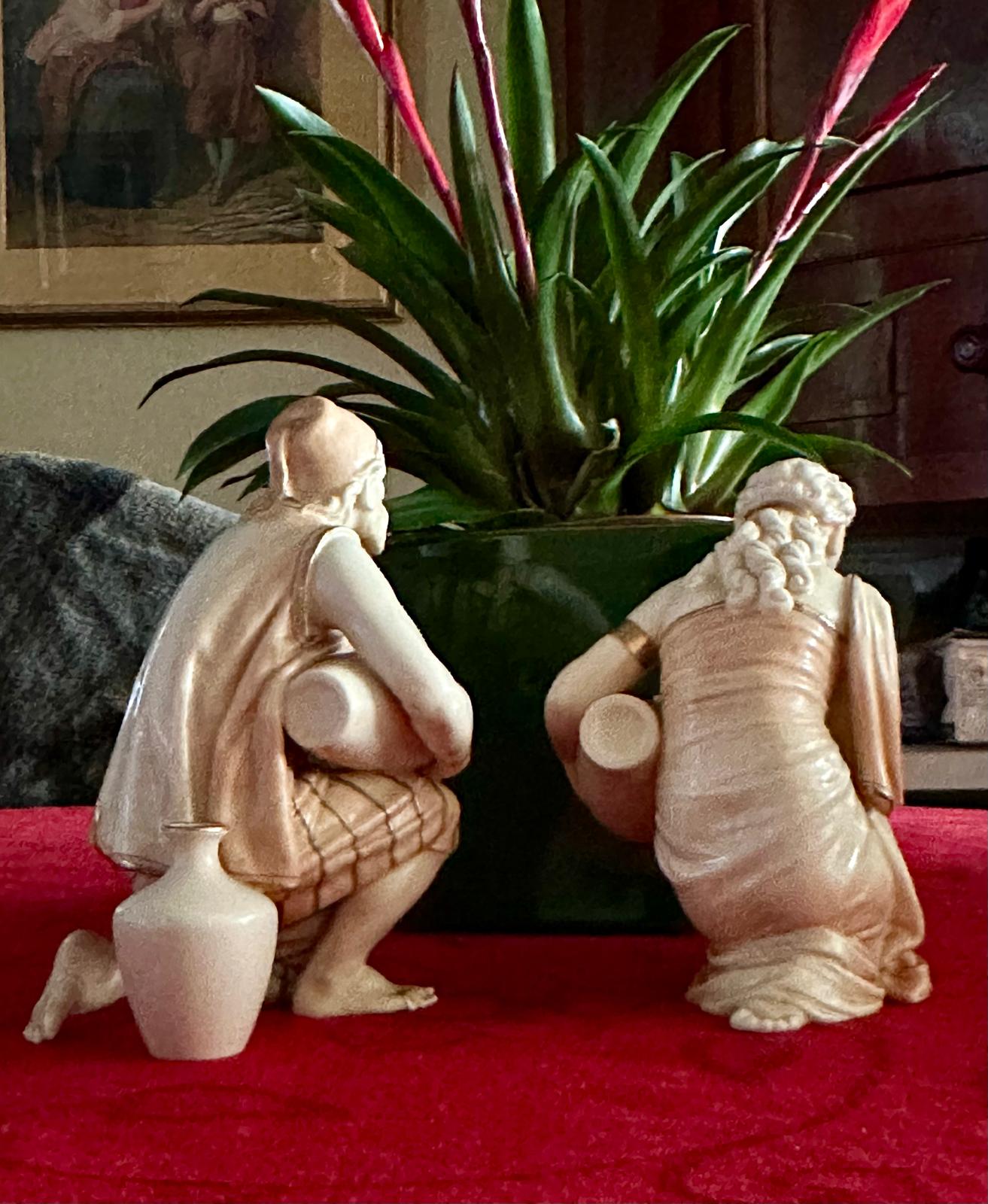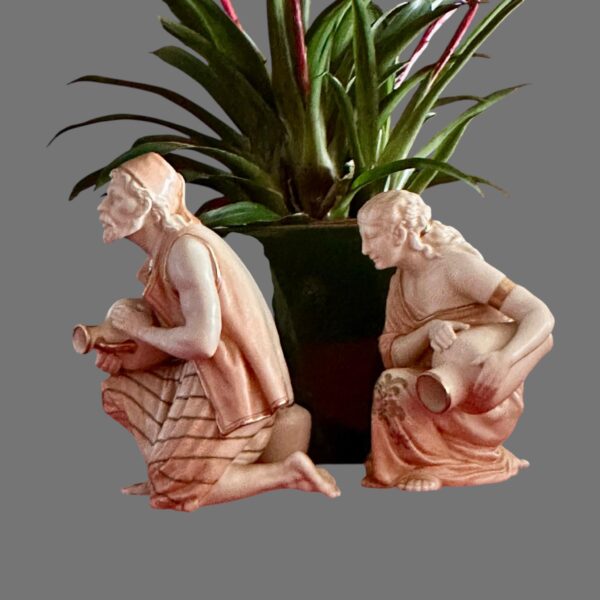 The male figure is depicted kneeling while holding a large vessel across his lap, his muscular form and contemplative expression rendered with notable sensitivity and anatomical accuracy. The female companion figure mirrors the composition in graceful symmetry, also kneeling and holding a water jar, her draped garments adorned with delicate hand-painted floral decoration. Both figures are finished in a warm ivory-toned glaze, enriched with subtle gilded accents to the robes and vessels, enhancing their sculptural elegance.