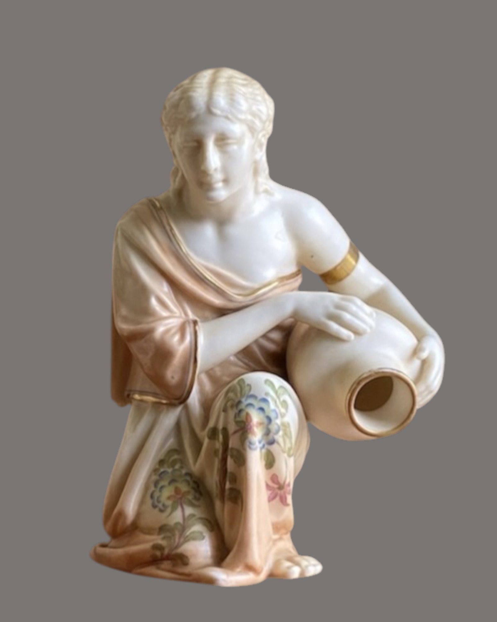 A refined and finely modelled pair of Royal Worcester porcelain figures, attributed to the distinguished modeller James Hadley and dating to the late Victorian or early Edwardian period. These kneeling water carriers exemplify the Orientalist and Neoclassical influences that were highly fashionable in British decorative arts during the late 19th century.