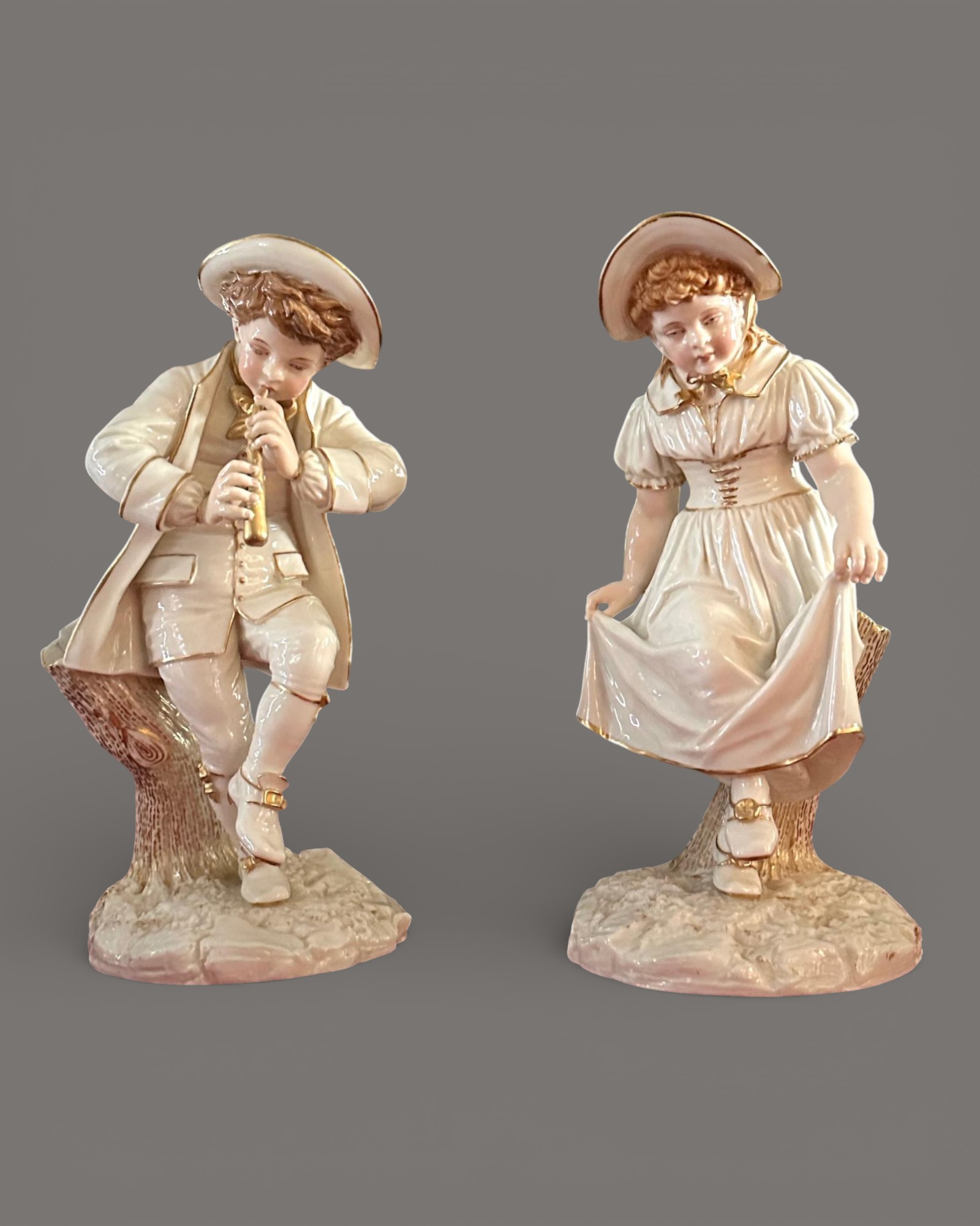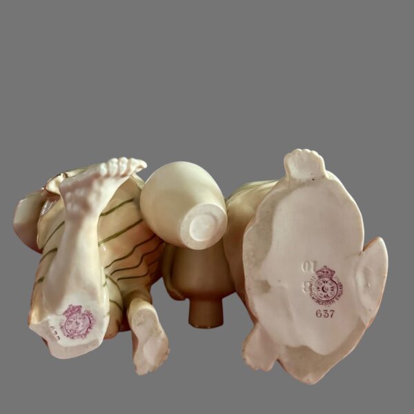 The careful modelling of drapery, expressive facial features, and harmonious balance between the two figures reflect the high technical standards and artistic refinement for which Royal Worcester was renowned during its golden period. A distinguished and decorative pair, ideal for collectors of fine English porcelain and late 19th-century decorative arts.