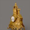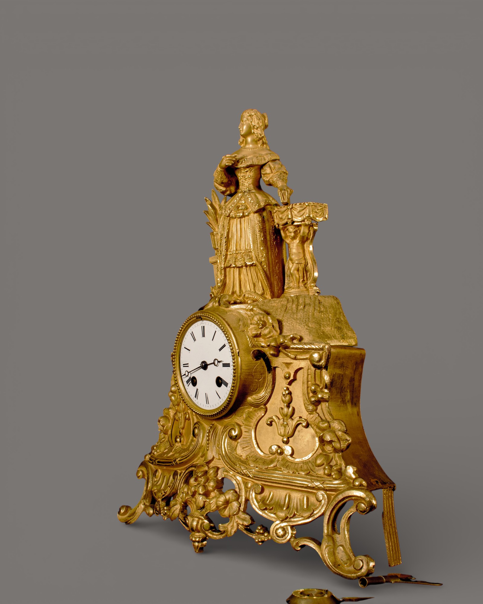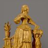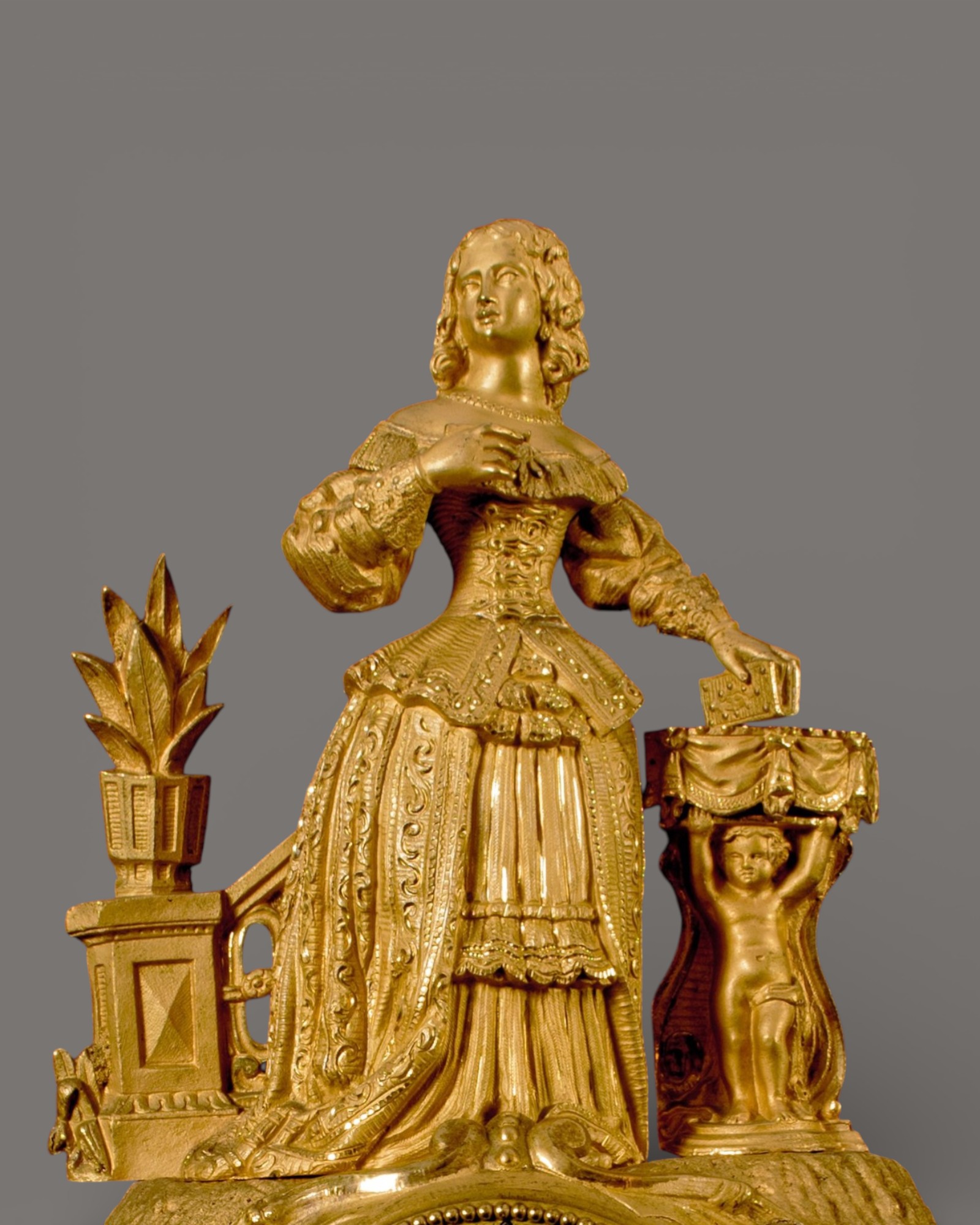An exceptional 19th-century French gilt bronze ormolu mantel clock of refined Rococo inspiration, beautifully modelled and richly fire-gilded. The case is surmounted by an elegant female figure in flowing classical dress, holding a book and standing beside a draped pedestal supported by a cherub. The sculptural group is finely cast and crisply chased, demonstrating the high level of craftsmanship associated with quality French bronze work of the period.