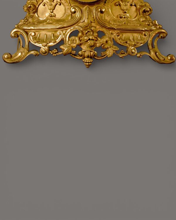 The fire-gilt ormolu retains a bright, warm tone with sharp definition to the chasing. The original enamel dial is in excellent condition, free from visible chips, cracks, or crazing. The clock is complete with its key and pendulum. Having been in storage for several years, it may benefit from servicing to ensure optimal performance.