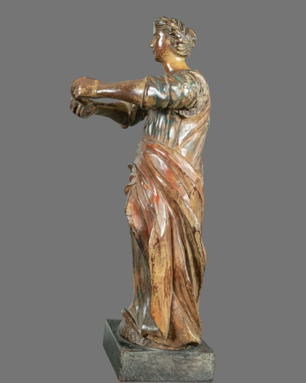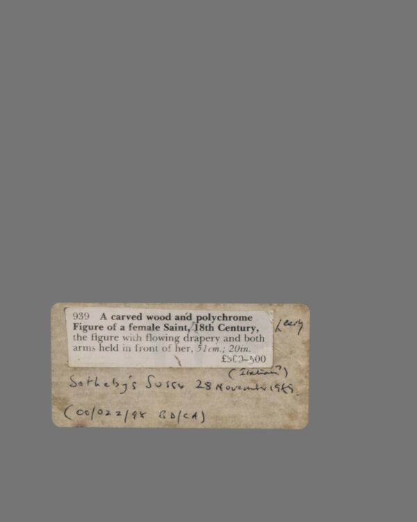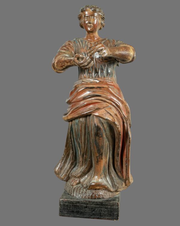 This captivating 18th-century Italian figure, carved from wood and adorned with vibrant polychrome, portrays a serene female saint. Her flowing drapery gracefully drapes around her form, capturing the movement and elegance of her attire. With both arms gently held in front of her, she exudes an aura of tranquillity and devotion.