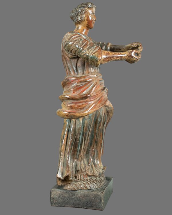 This captivating 18th-century Italian figure, expertly carved from wood and adorned with original polychrome remnants, portrays a serene female saint. The sculpture captures the movement and elegance of the Baroque period, with flowing drapery that cascades gracefully around her form. Her tranquil expression and the gentle positioning of her arms convey an aura of profound devotion and spiritual serenity.