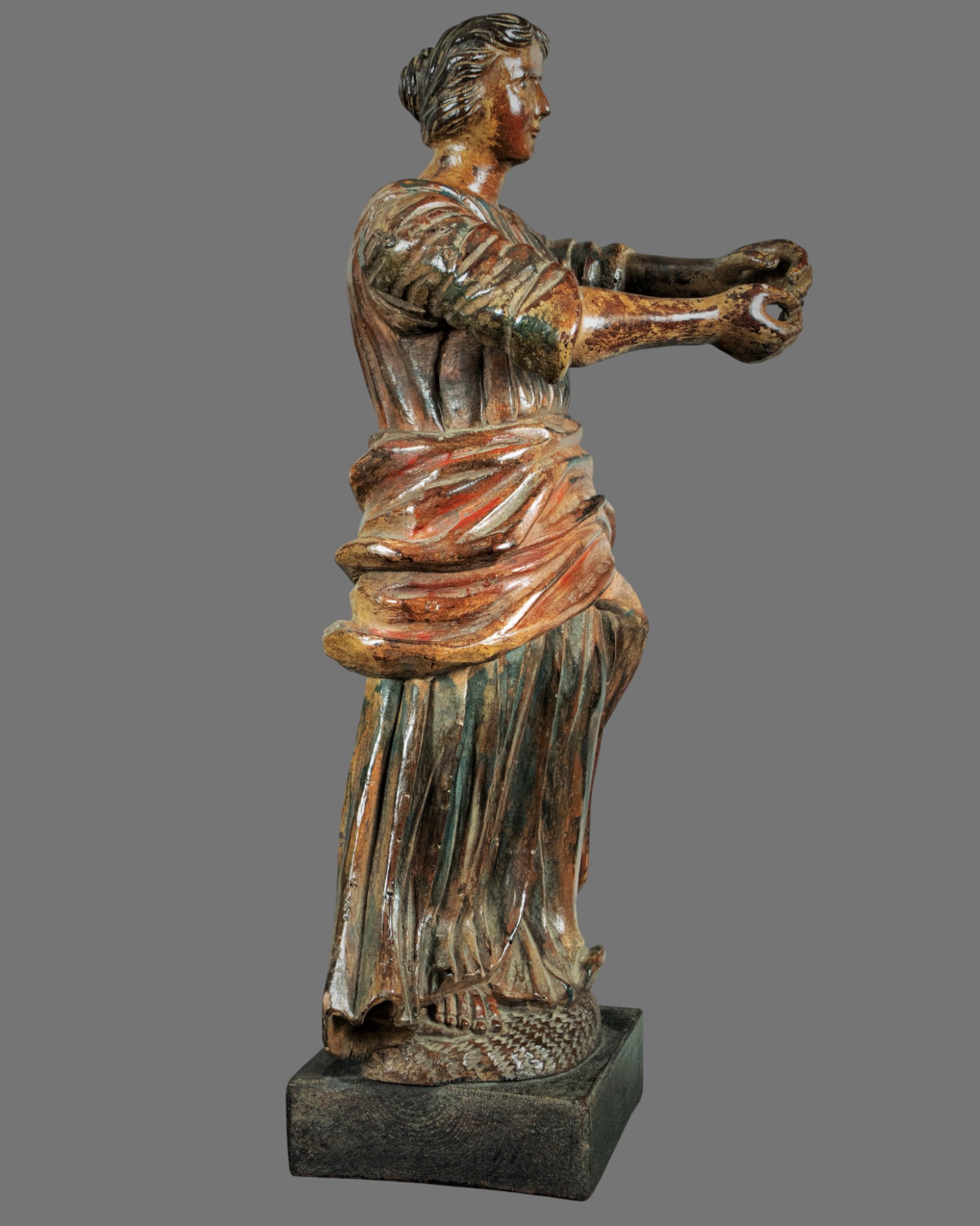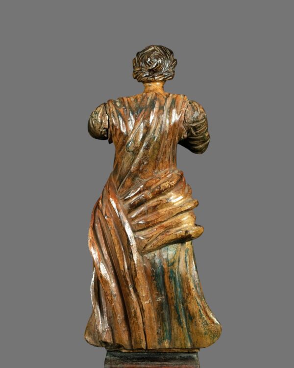 Base: The saint rests upon a later, subtly finished base that complements her timeless silhouette.