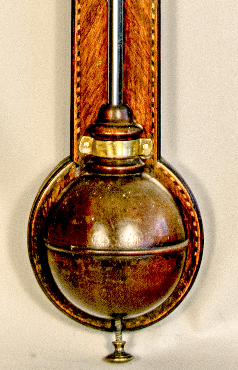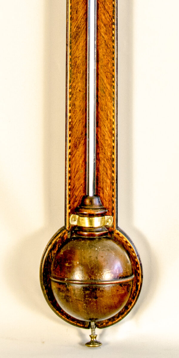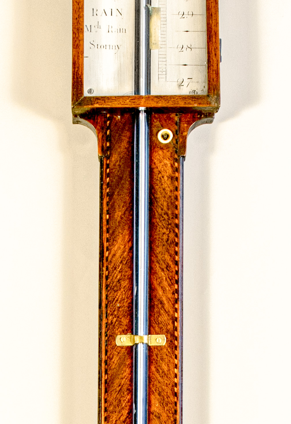The case displays finely executed herringbone mahogany veneers with boxwood line inlay, surmounted by a broken architectural pediment. A silvered registered scale fitted with manual vernier adjustment sits behind its original glazed door. The mercury tube terminates in a concealed mahogany cistern housed within a turned hemispherical cover.