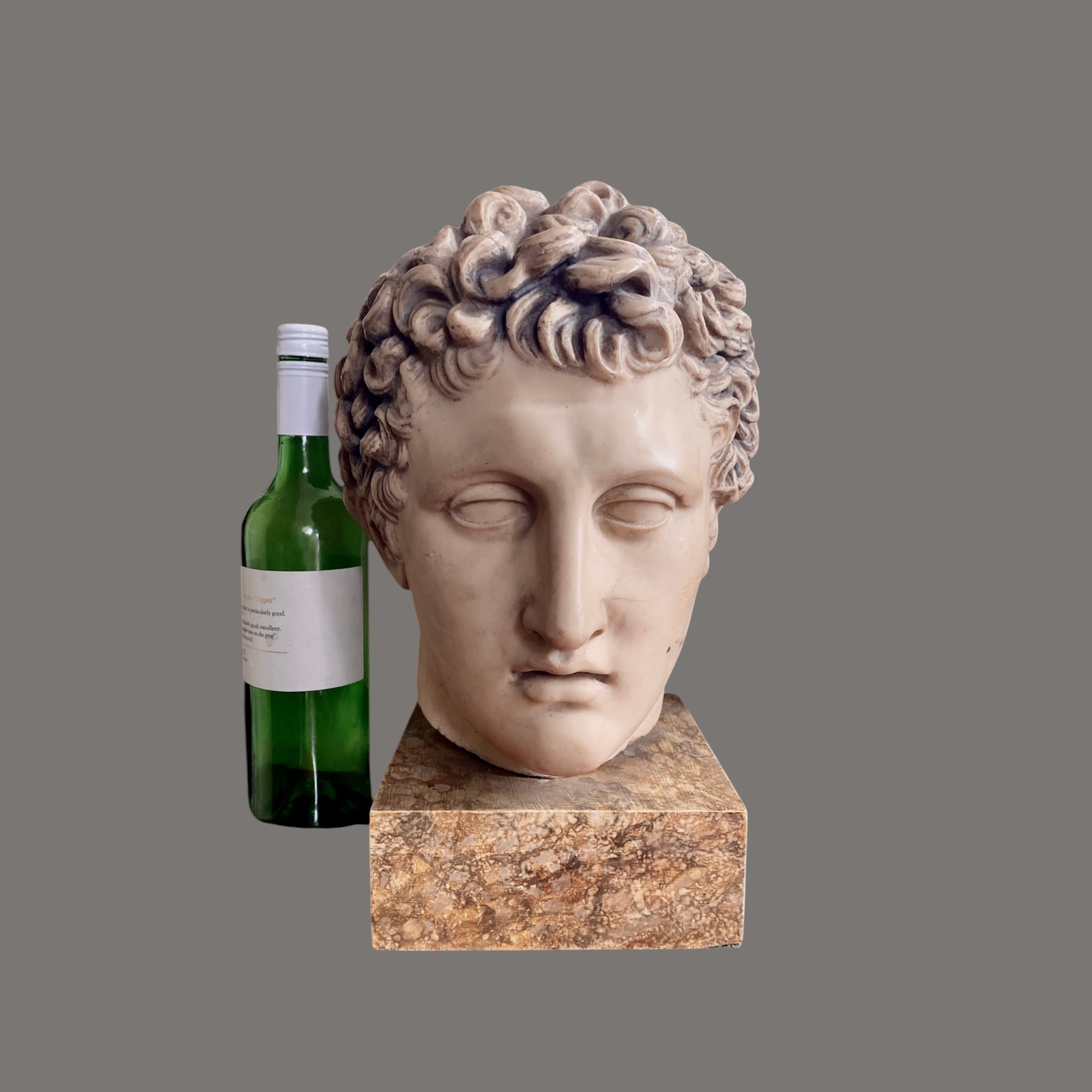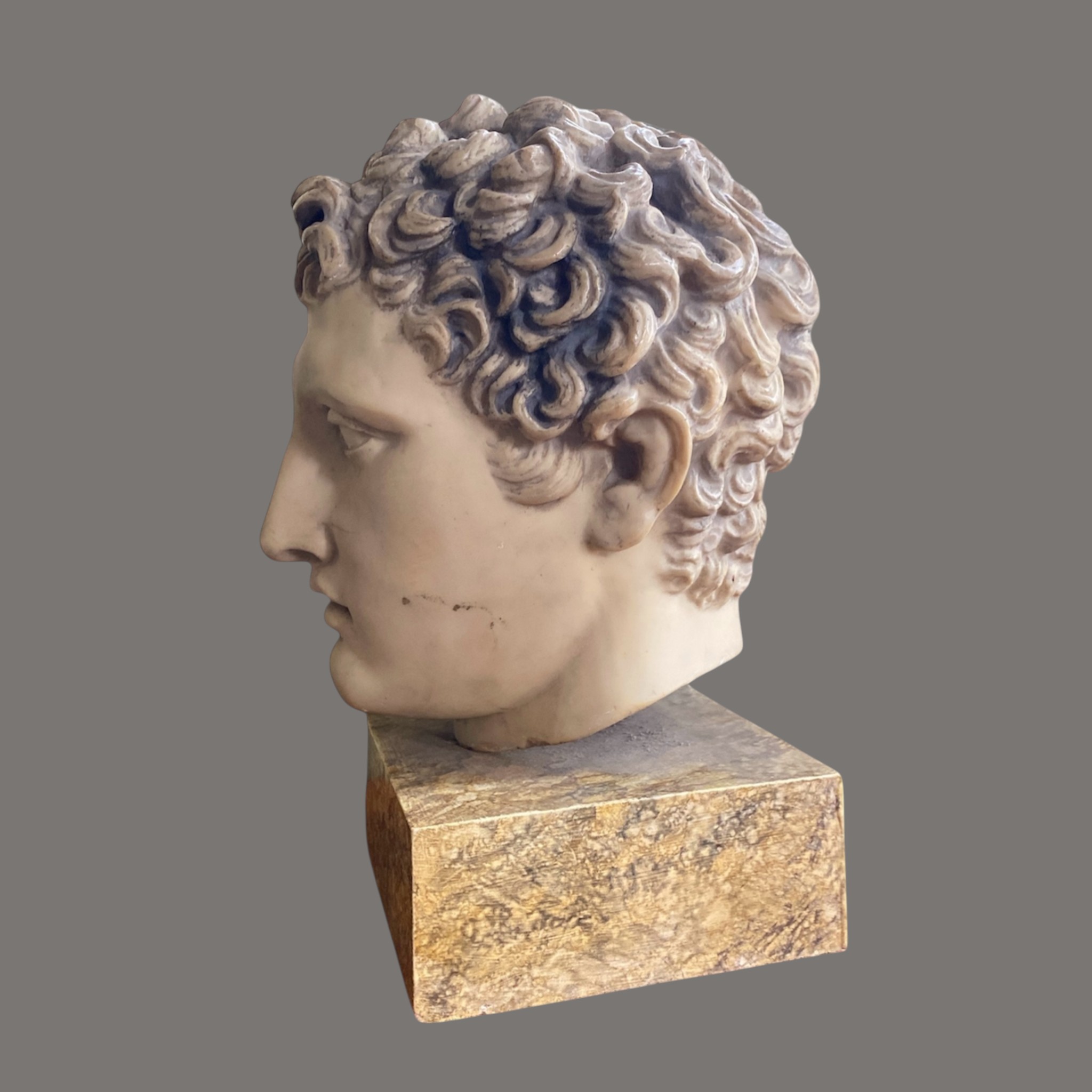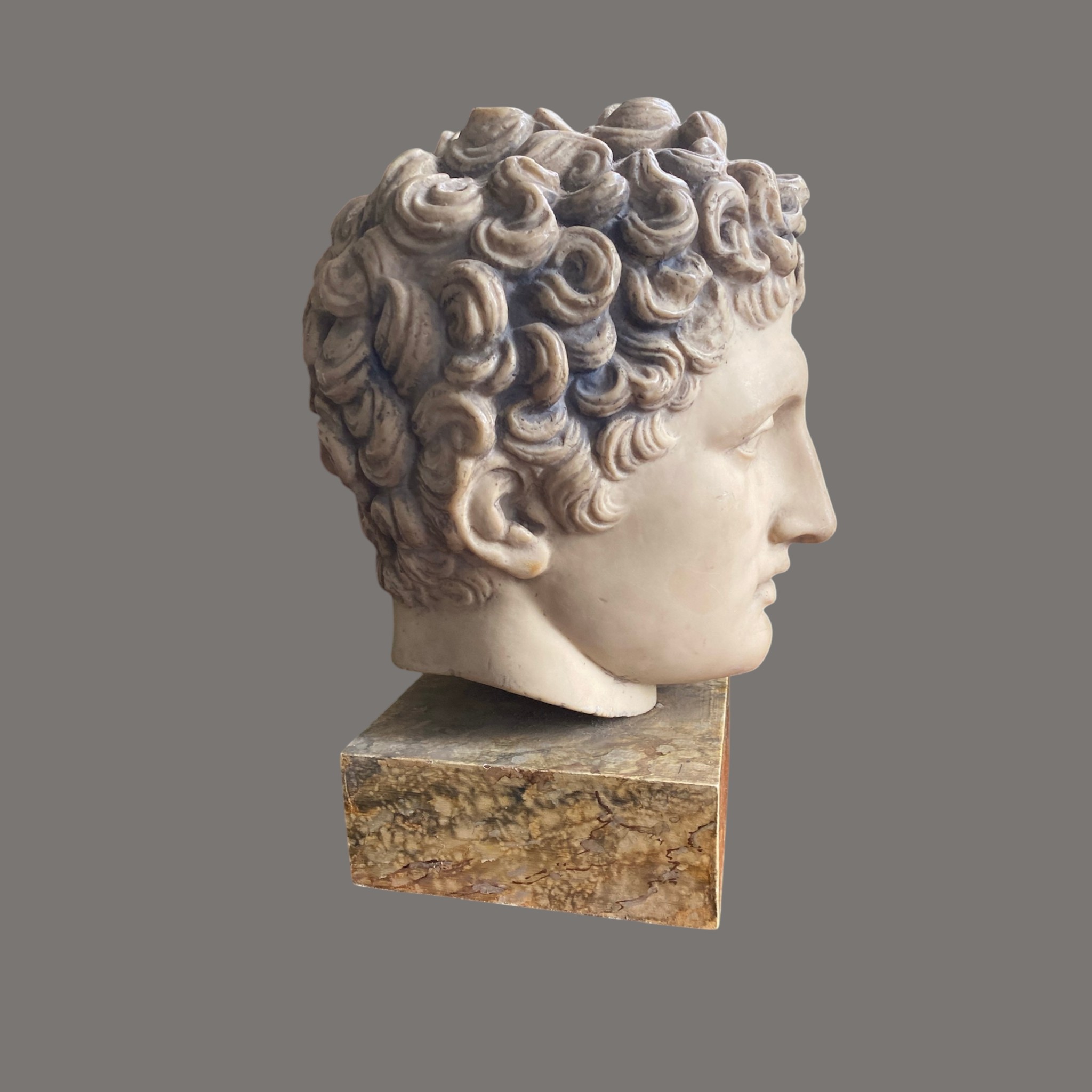 The blank, uncarved eyes follow traditional classical conventions, enhancing its timeless, contemplative expression. Mounted on a polished variegated marble plinth, the work reflects the enduring influence of antiquity on later decorative arts. Likely produced in the 20th century as a Grand Tour or atelier reproduction, it embodies both academic precision and decorative appeal. Modelled and made by the British Museum, London.