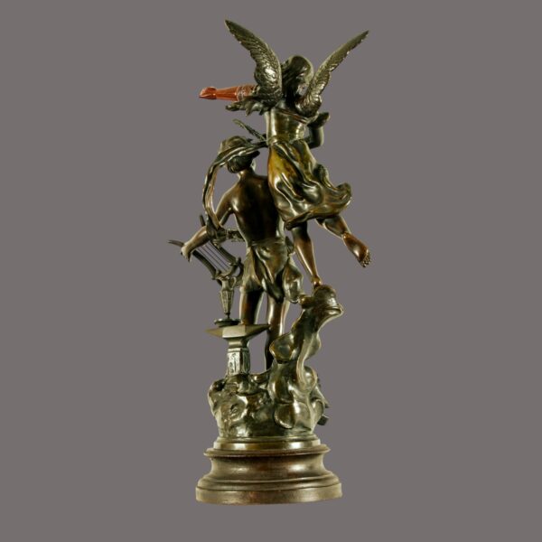 At an impressive 24.5″H × 13.5″ W × 9.5″D, this commanding sculpture commands presence in any refined setting. It represents not merely decoration, but a rare opportunity to acquire a genuine piece of French artistic heritage—a celebration of creativity itself, immortalised in metal by one of the Belle Époque’s most skilled sculptors.