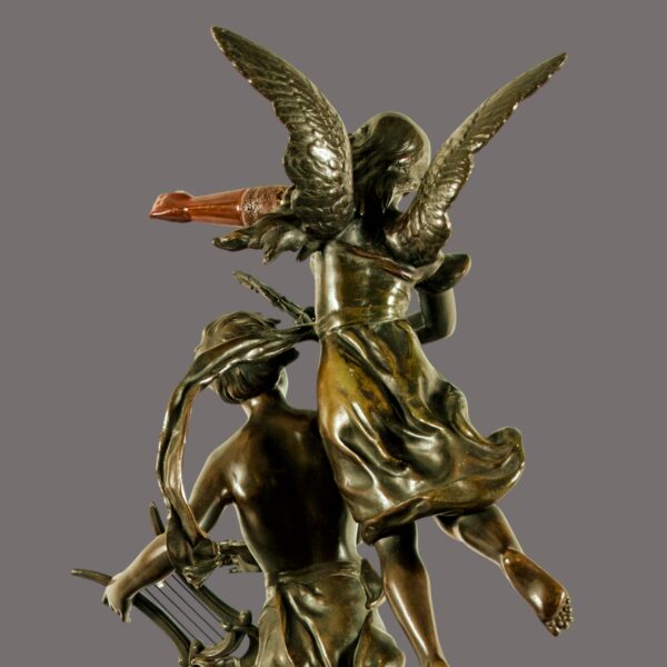 Executed in finely bronzed spelter with meticulous attention to form and movement, every element reveals Kossowski’s masterful hand: the flowing drapery catches light with sculptural grace, the figures’ expressions convey genuine emotion, and the symbolic attributes—musical instruments and sculptor’s tools—are rendered with extraordinary precision. The rich, aged patina speaks to over a century of history, adding depth and character that only time can bestow.