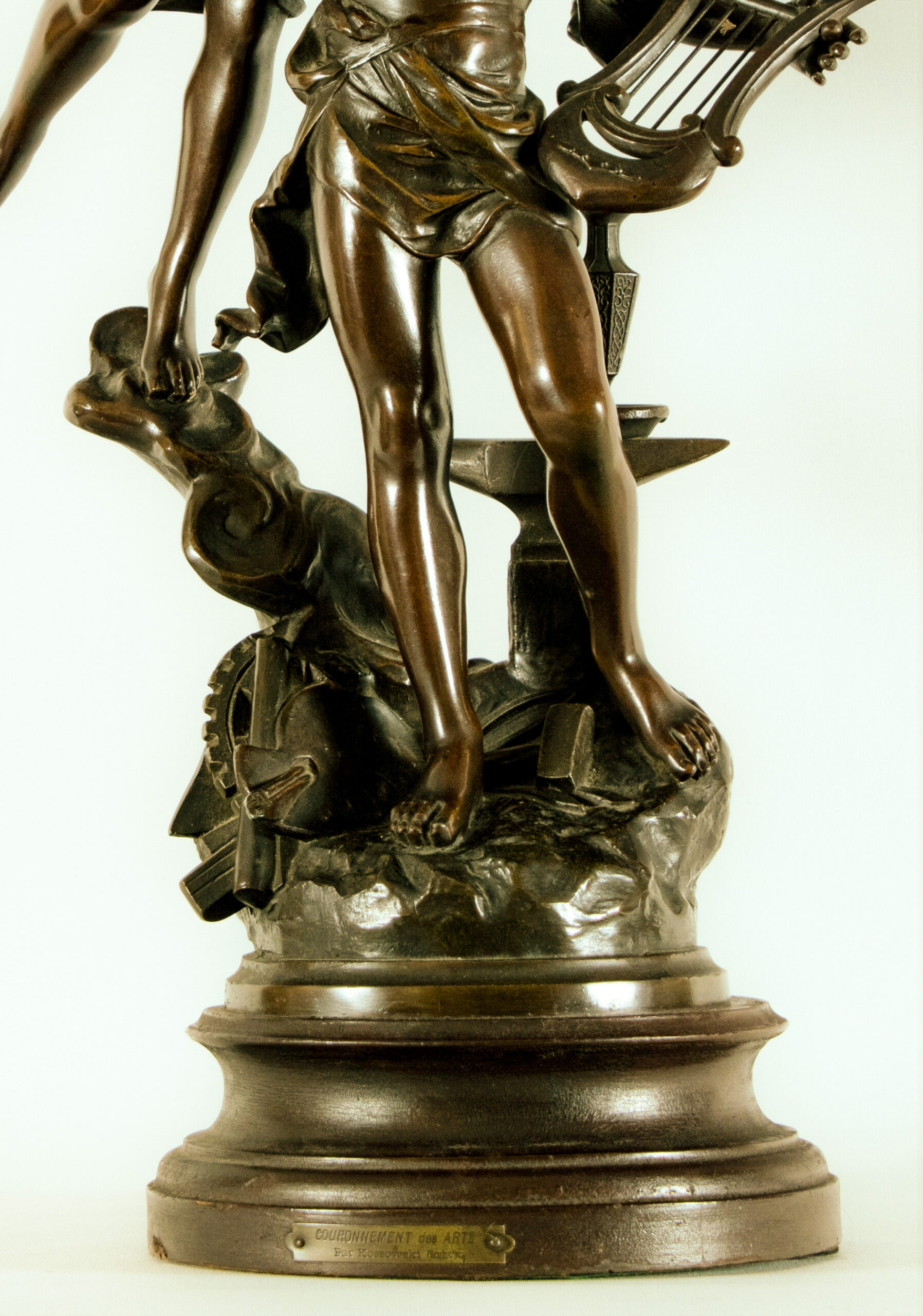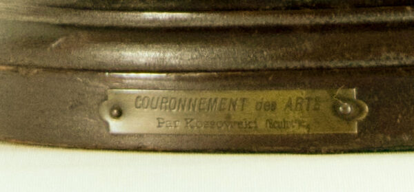 Kossowski, a Polish sculptor active in France, exhibited at the Paris Salon and is known for his expressive allegorical and historical figures. This example bears his engraved signature and is titled “Couronnement des Arts”, celebrating the triumph and patronage of artistic achievement.