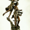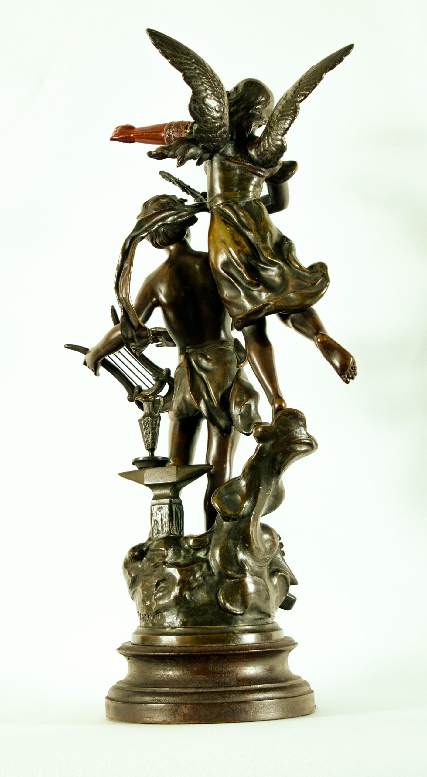 The sculpture is executed in bronzed spelter and remains on its original stepped base, retaining strong surface patina and crisp detailing throughout the figures and drapery.