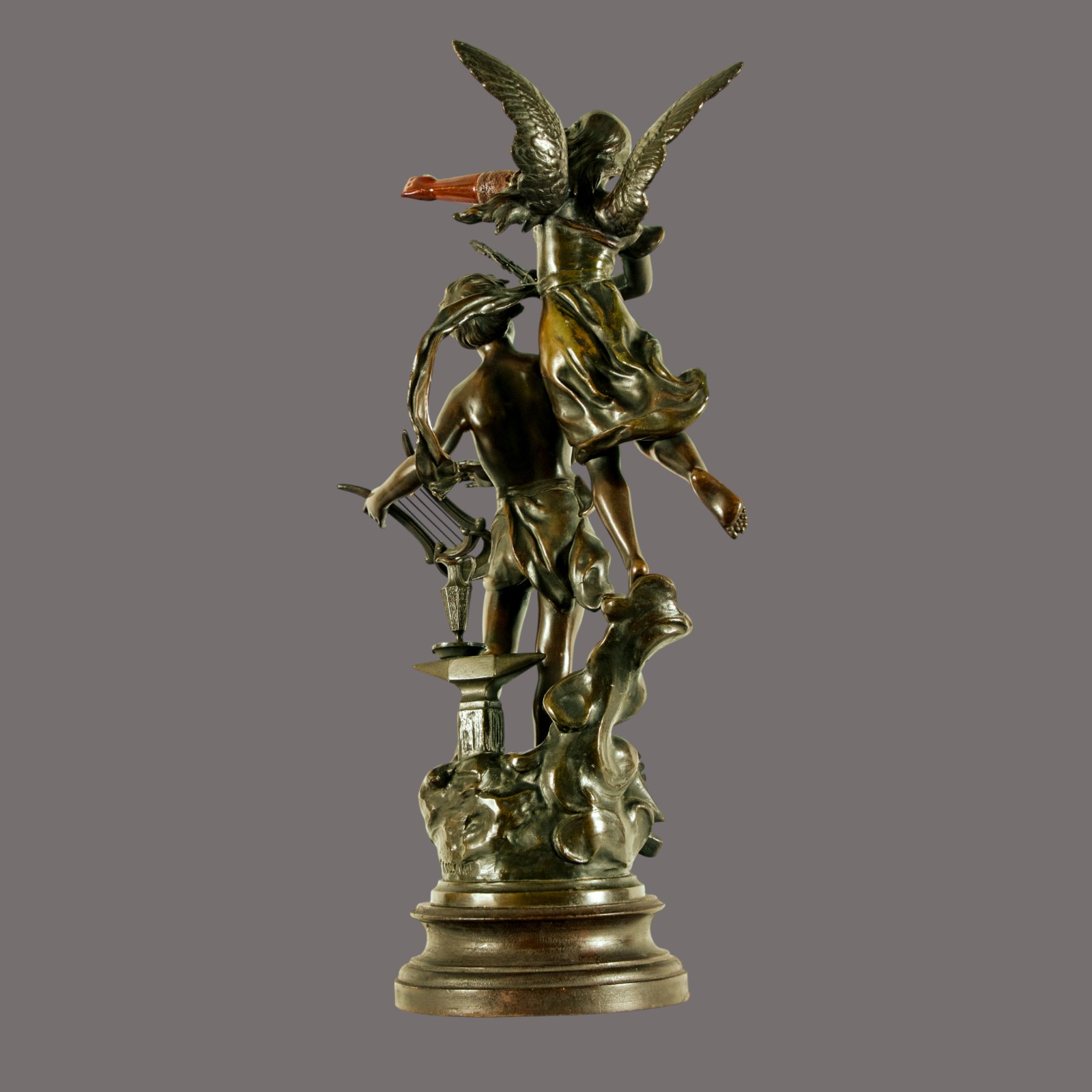 Executed in finely bronzed spelter with meticulous attention to form and movement, every element reveals Kossowski’s masterful hand: the flowing drapery catches light with sculptural grace, the figures’ expressions convey genuine emotion, and the symbolic attributes—musical instruments and sculptor’s tools—are rendered with extraordinary precision. The rich, aged patina speaks to over a century of history, adding depth and character that only time can bestow.