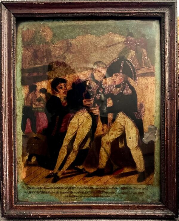 Following Nelson’s death, such images were widely produced for domestic display, serving both as memorials and symbols of national pride. These prints were often hand-coloured and mounted behind glass, sometimes with reverse-painted details, and framed for household interiors during the Regency period.