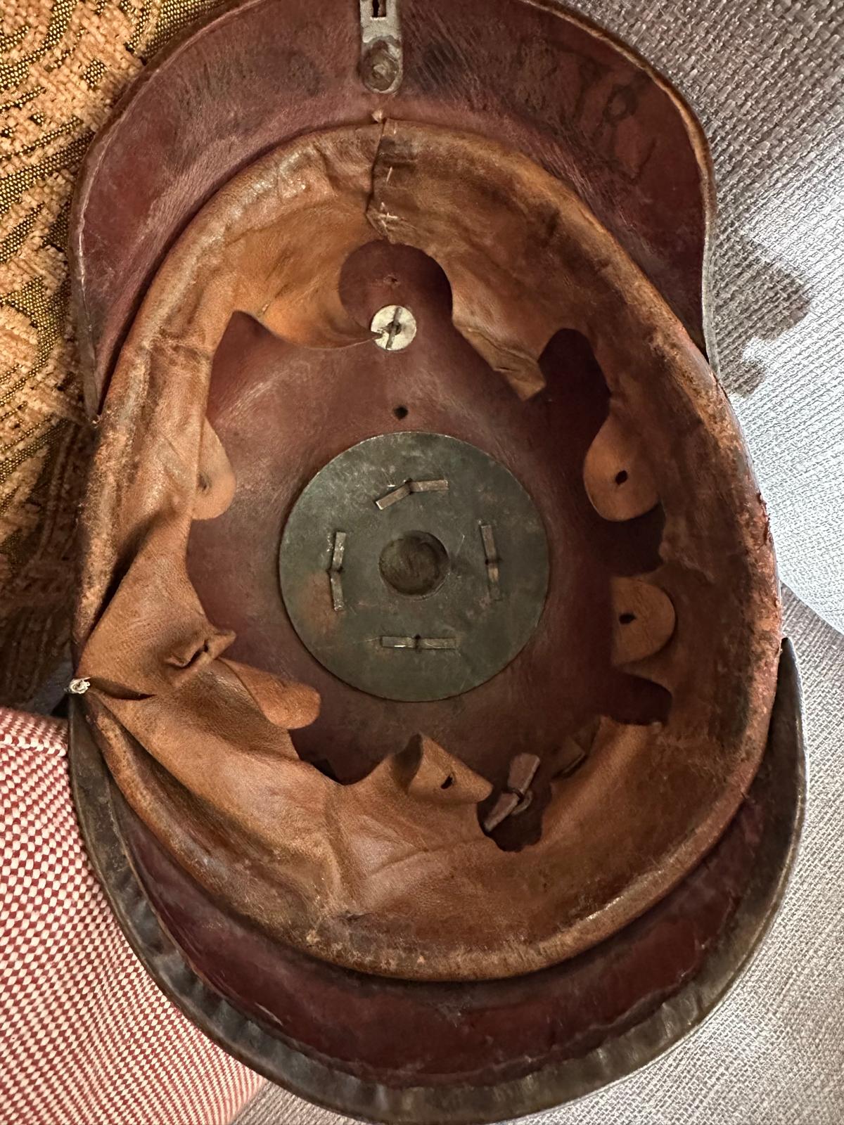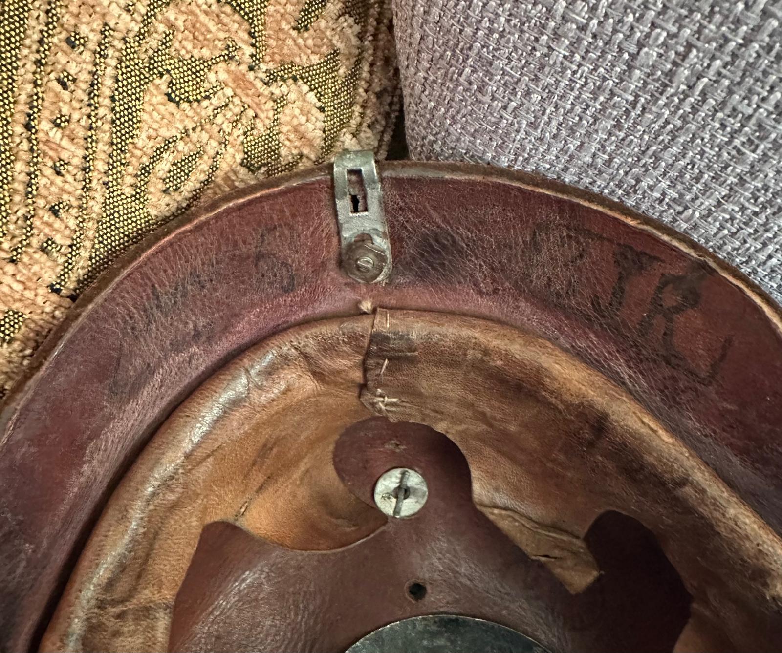 Good, with period-consistent wear to leather and metal fittings; interior liner original; chinstrap re-placed; markings visible inside rear visor.