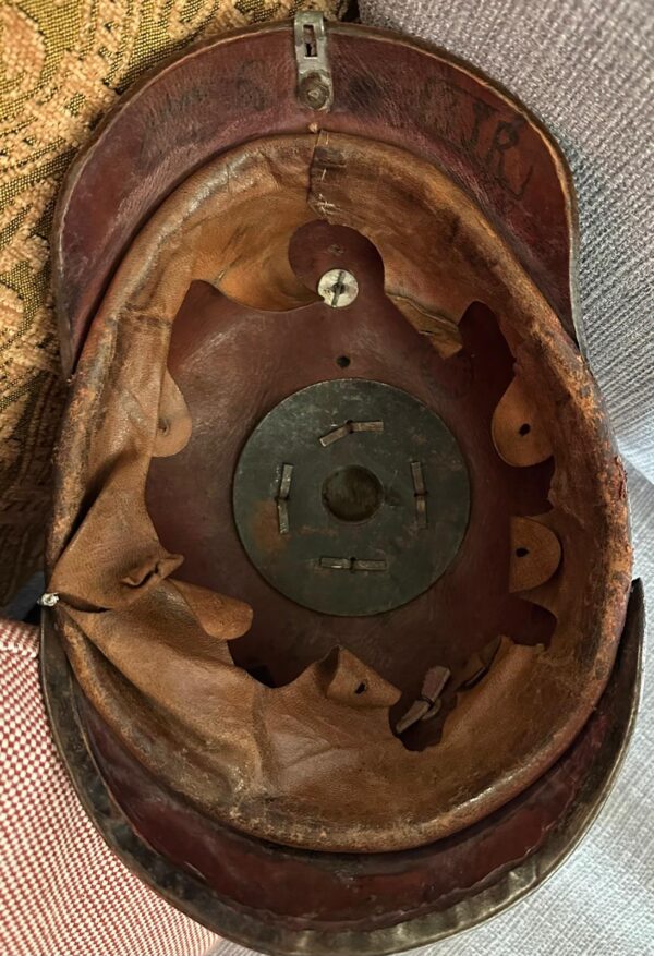 The rear visor bears an ink-applied marking interpreted as “3 J.R.,” consistent with field or soldier-applied identification for the 3rd Jäger Regiment or related Bavarian light infantry formation. While not an arsenal-stamped depot mark, this attribution aligns with the helmet’s Bavarian fittings and con-figuration. The shell shows age-appropriate lacquer checking and patina typical of service-used exam-ples from the period.