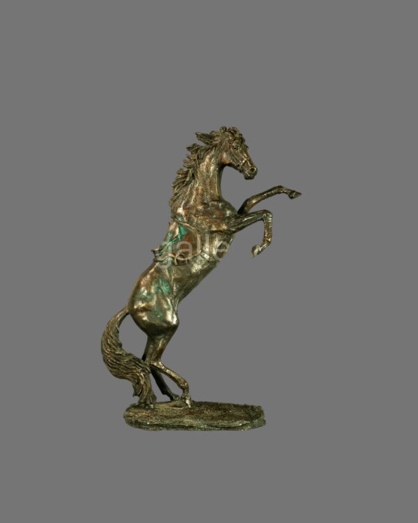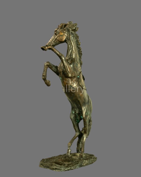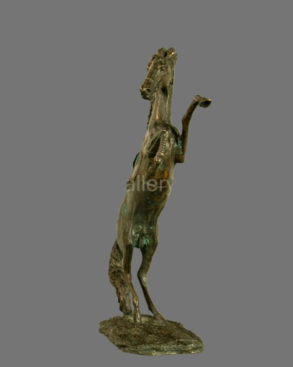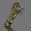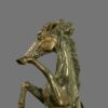 This striking vintage bronze sculpture captures the powerful energy and elegance of a horse in full motion, depicted rearing dynamically with raised forelegs and flowing mane. The sculptor has expertly rendered the muscular structure and movement of the animal, creating a strong sense of vitality and balance.