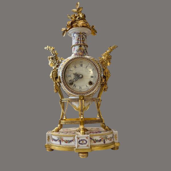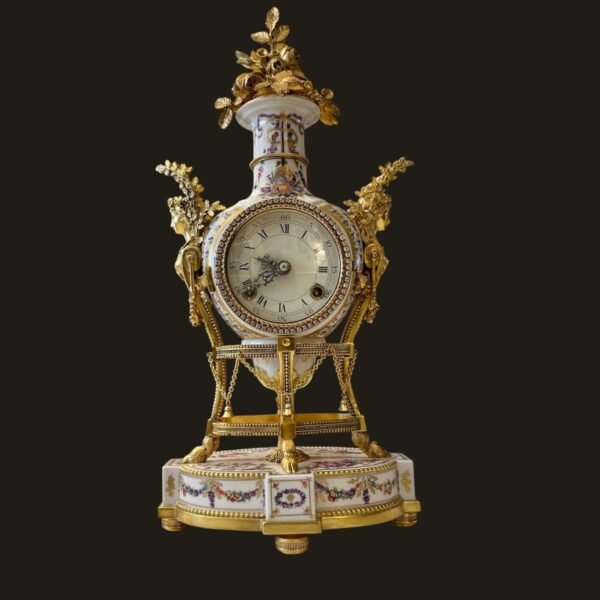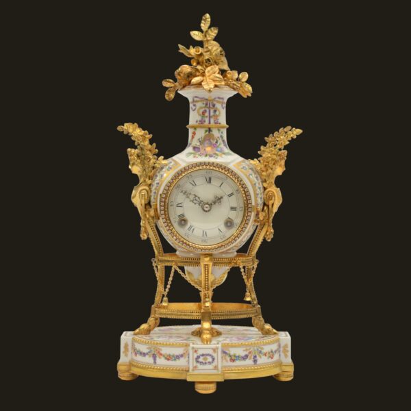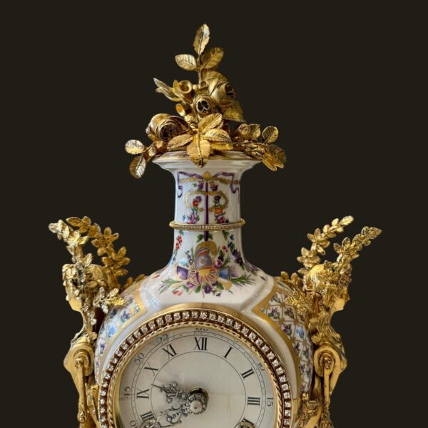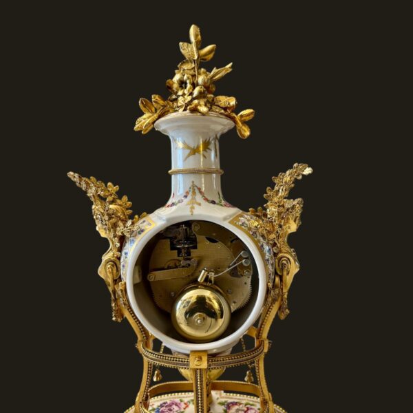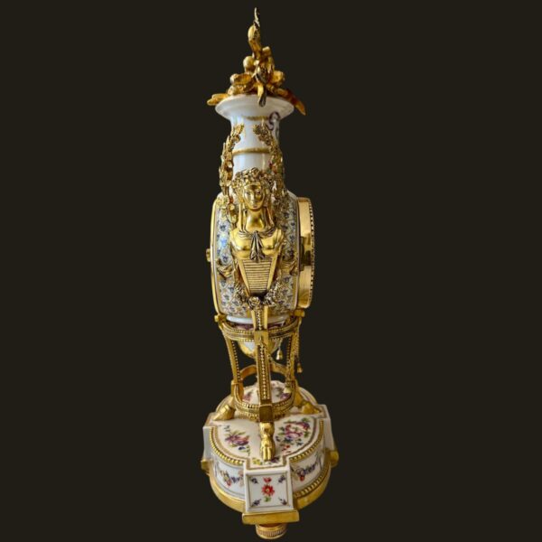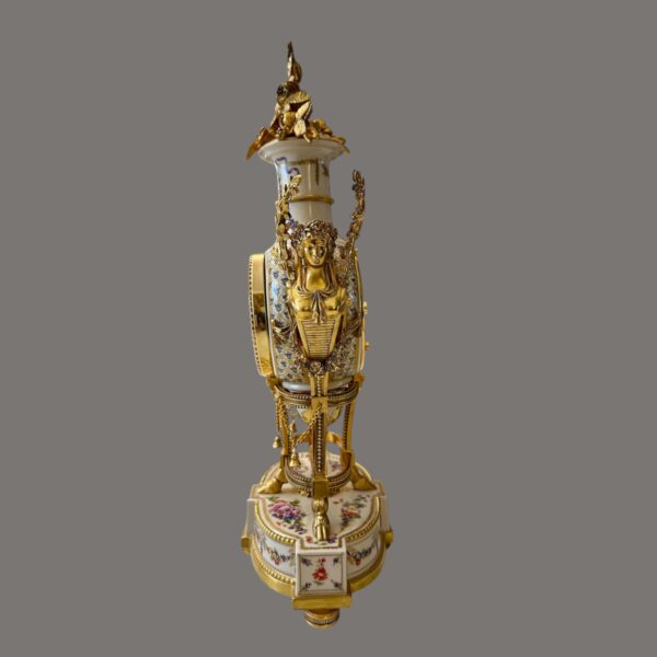 The finely modelled porcelain case is of elegant urn form, richly adorned with delicate polychrome floral sprays and ribbon motifs, echoing the refinement of 18th-century Sèvres style. The body is surmounted by an elaborate gilt metal flower spray finial, with finely cast caryatid handles to either side, enhancing its sculptural presence and symmetry.
