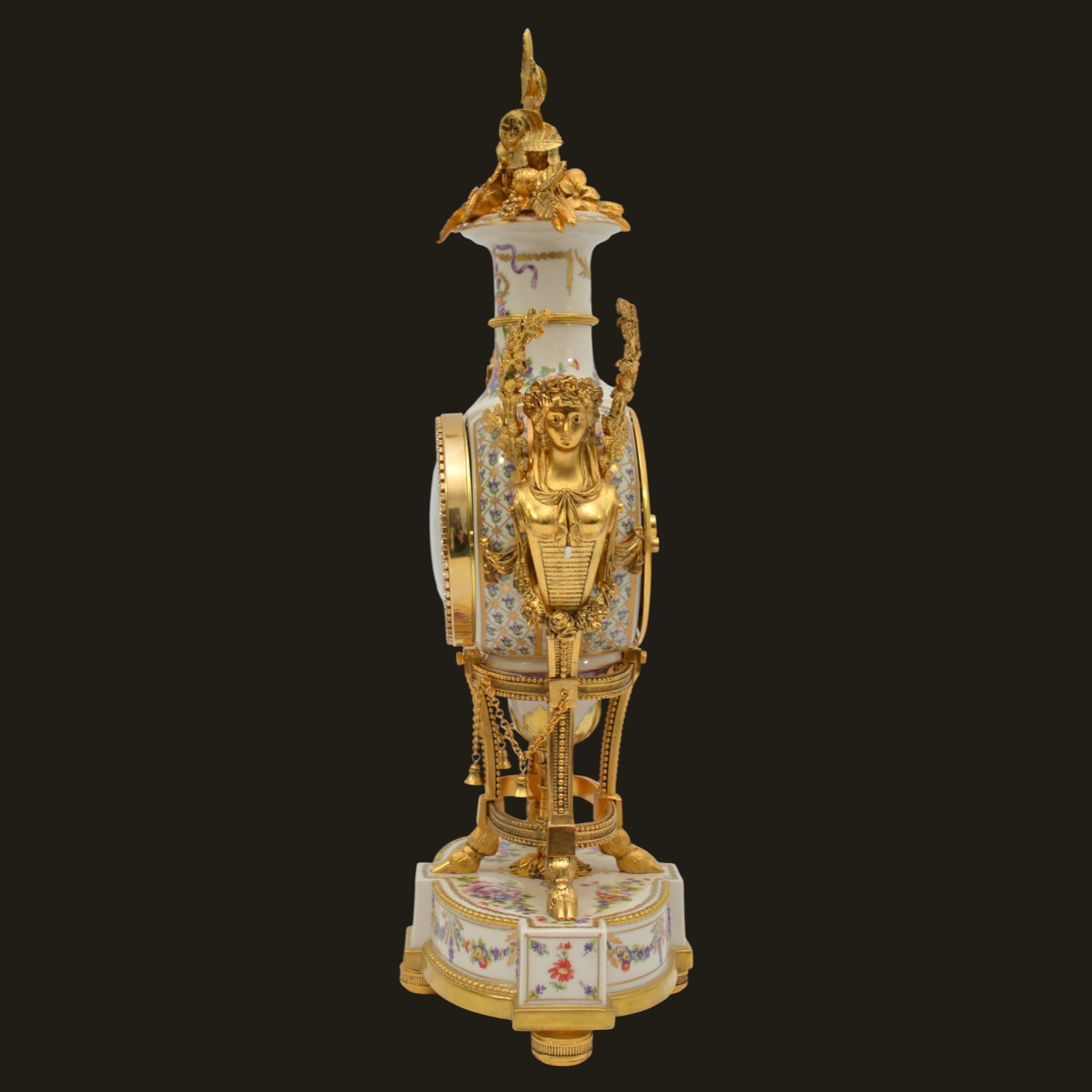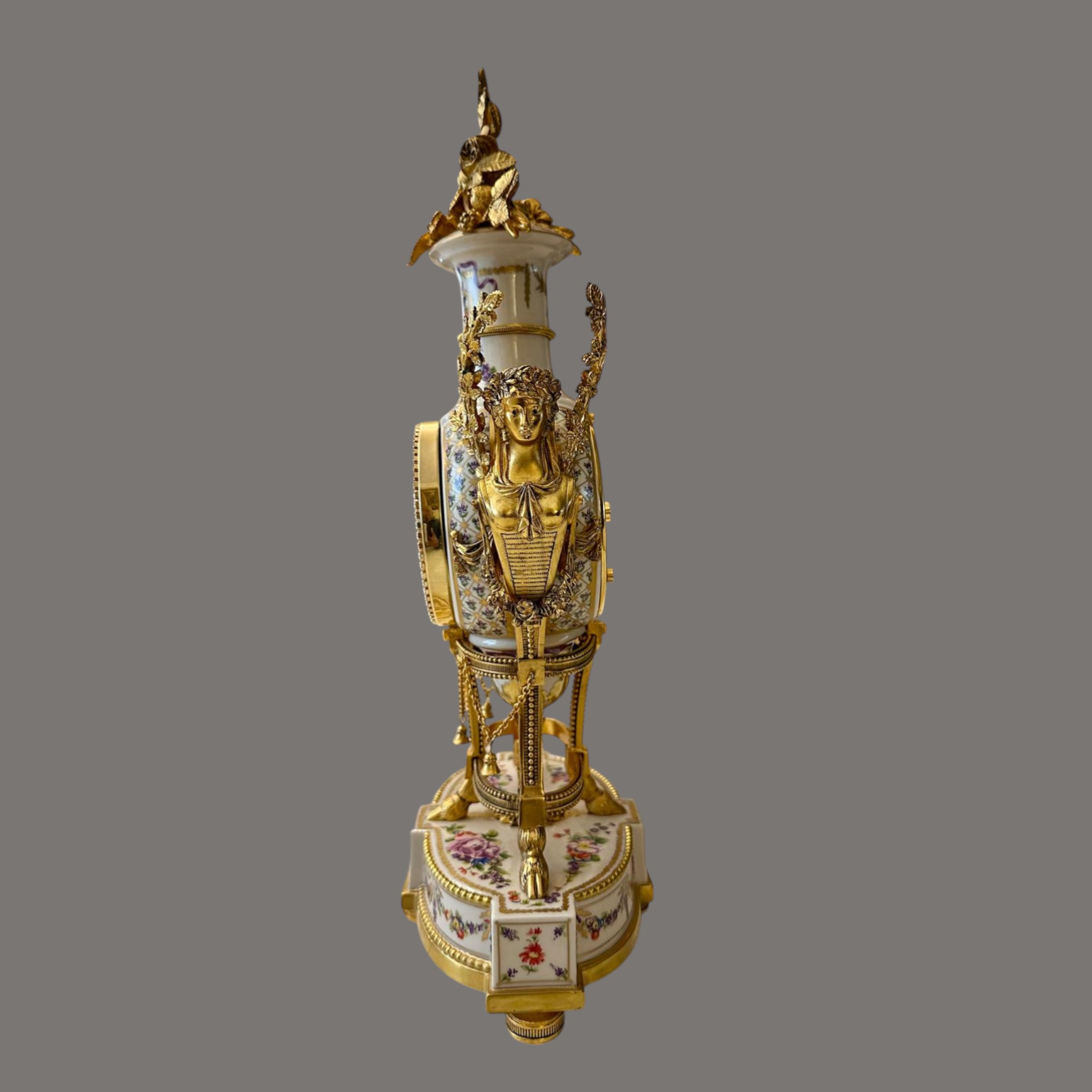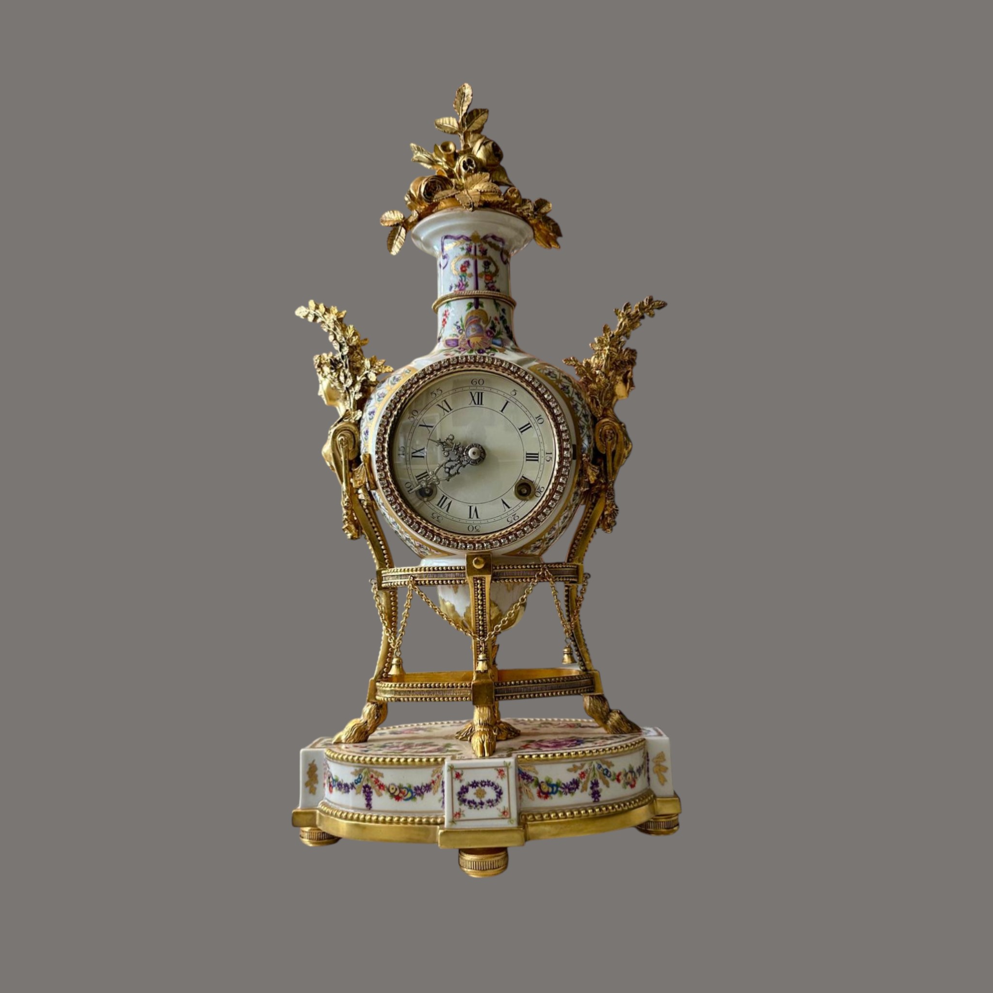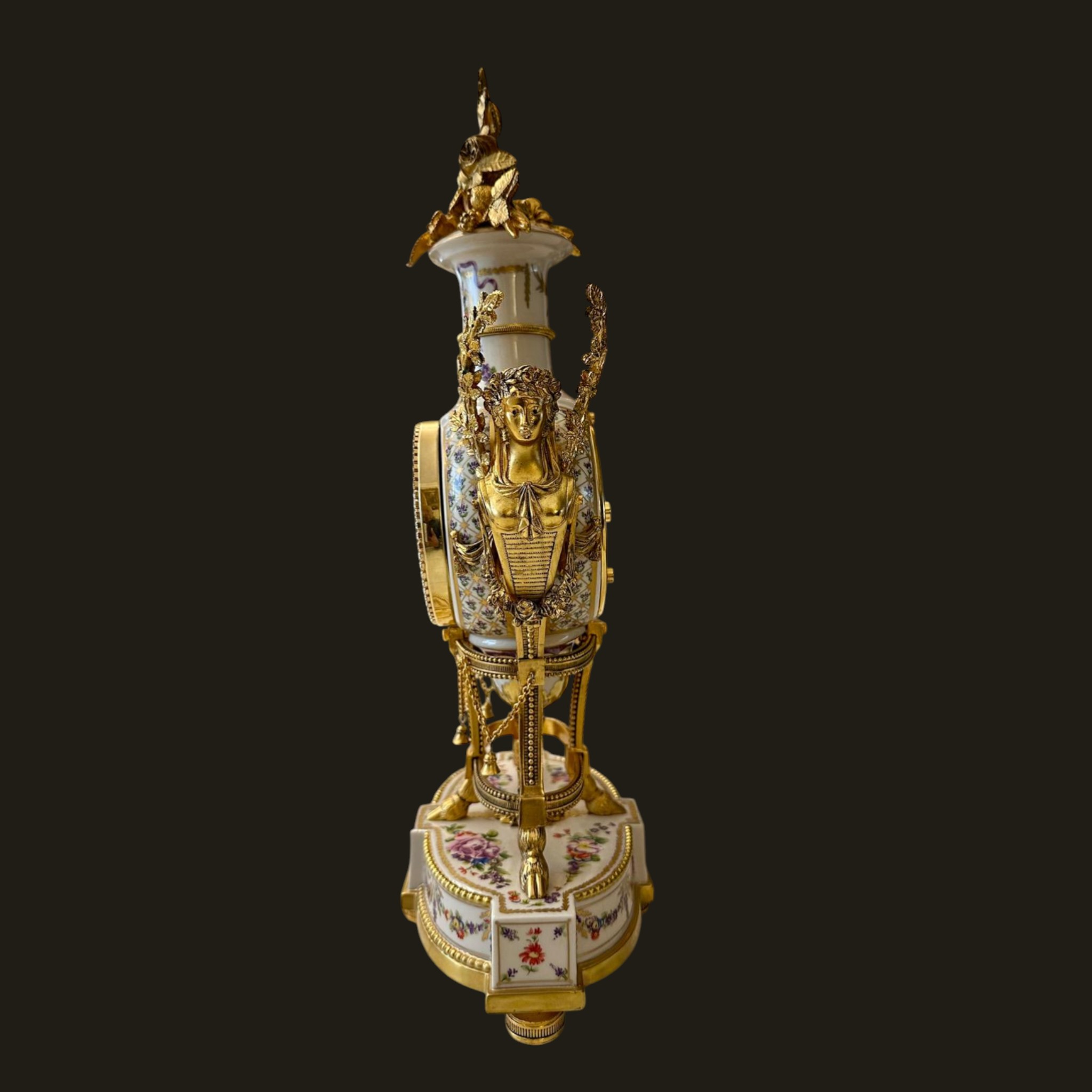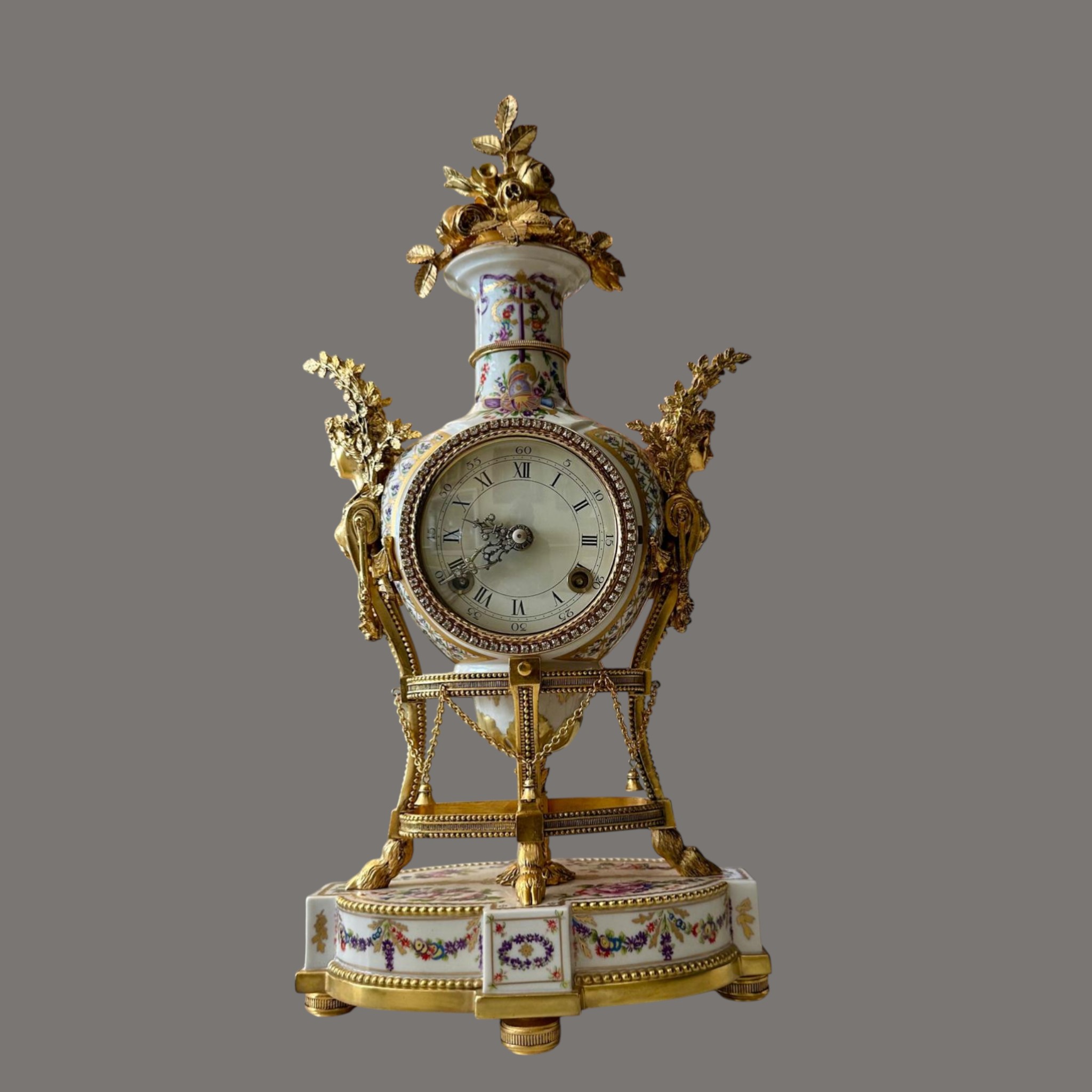 The finely modelled porcelain case is of elegant urn form, richly adorned with delicate polychrome floral sprays and ribbon motifs, echoing the refinement of 18th-century Sèvres style. The body is surmounted by an elaborate gilt metal flower spray finial, with finely cast caryatid handles to either side, enhancing its sculptural presence and symmetry.