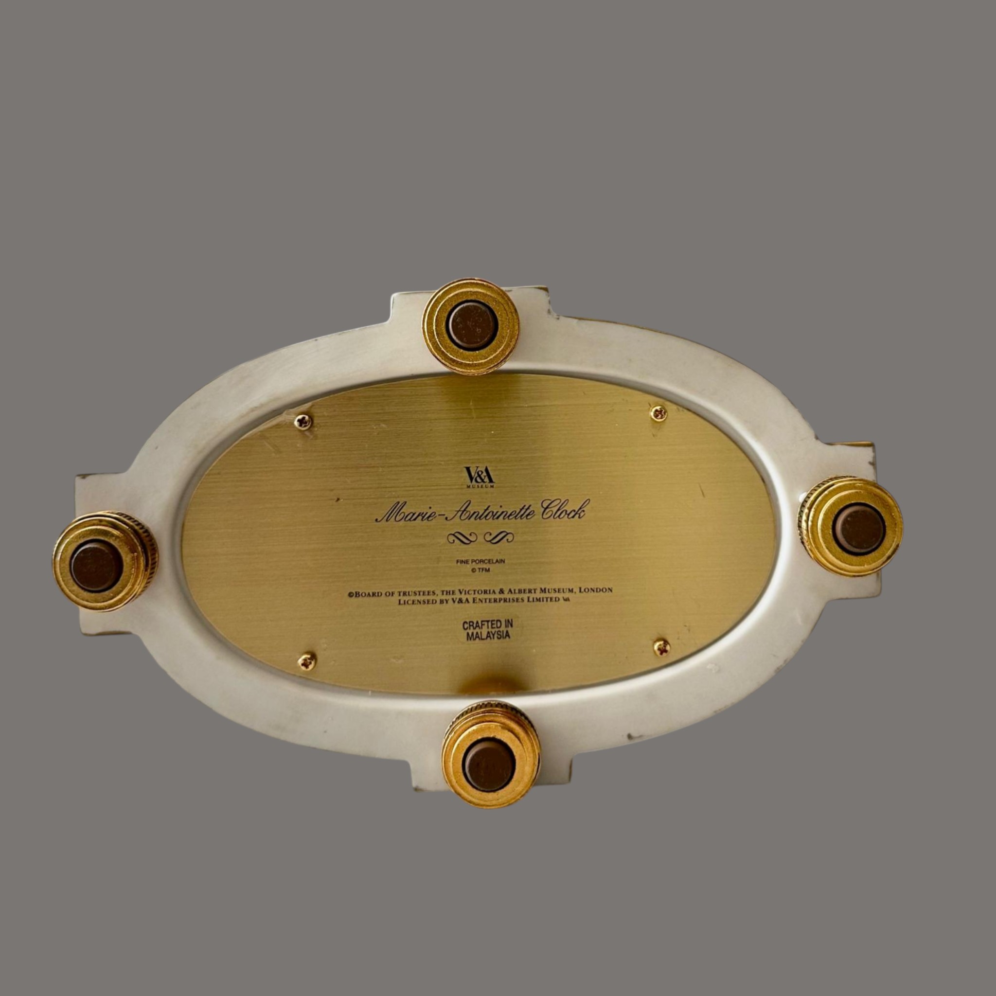 Raised on a shaped base with further porcelain panels and gilt detailing, the piece exemplifies the high-quality decorative reproductions issued under licence by the Victoria and Albert Museum, drawing on original designs associated with the courtly elegance of Marie Antoinette and Versailles.
