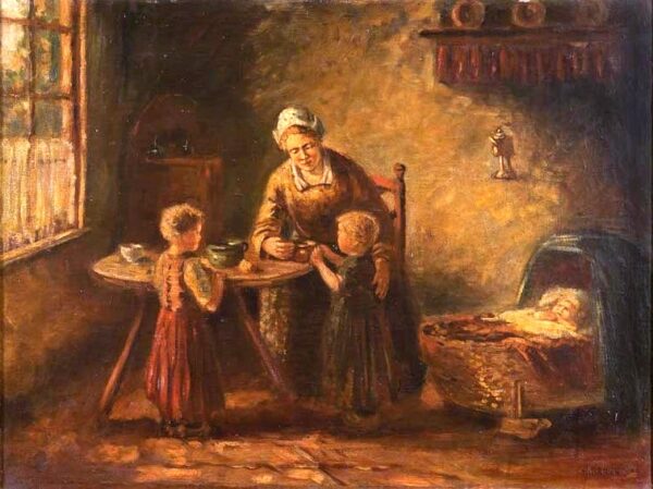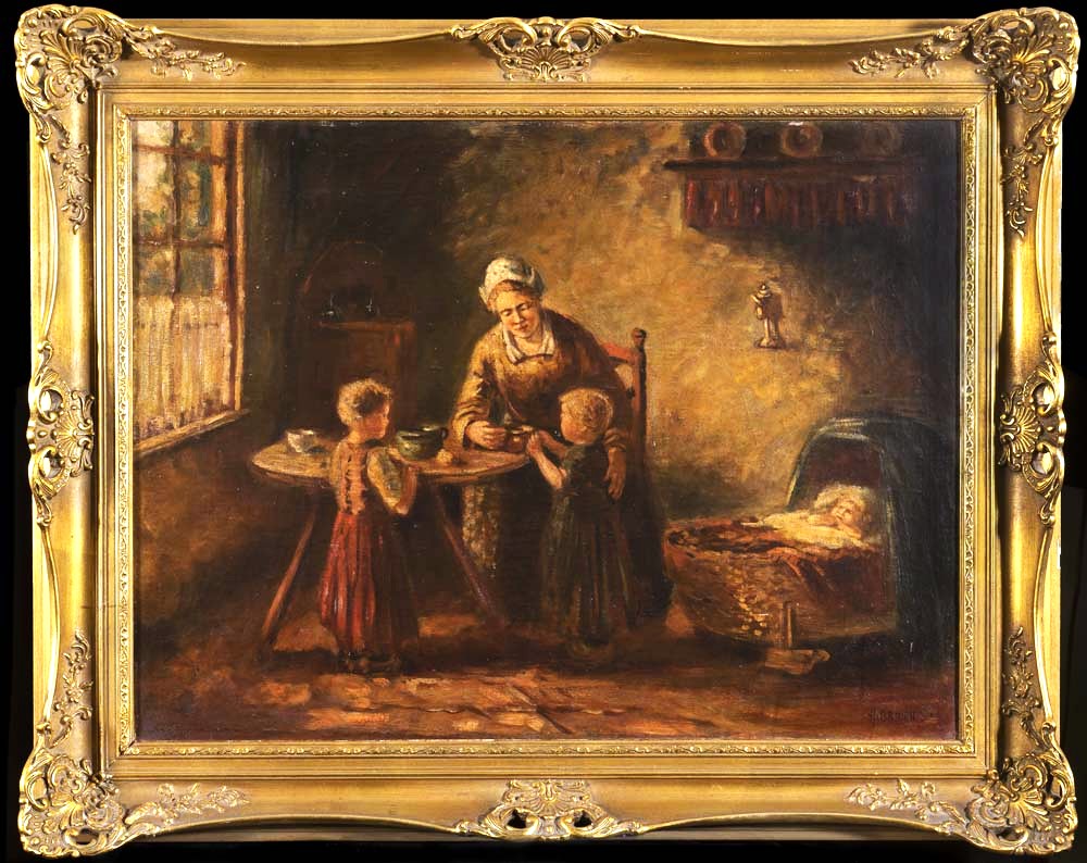 A finely executed late 19th-century German oil on canvas depicting a tender domestic cottage interior. The composition shows a mother seated at a small table feeding a young child while an older sibling looks on attentively, with a third infant peacefully asleep in a cradle nearby. Warm, subdued lighting and earthy tones create an intimate atmosphere characteristic of German genre painting of the period, evoking themes of maternal care and rural family life. The work is signed at the lower right “H. Brauen.” Presented in an ornate period-style gilt frame. The painting remains in excellent condition with stable craquelure and age-appropriate patina; the frame shows minor chips and marks consistent with age.