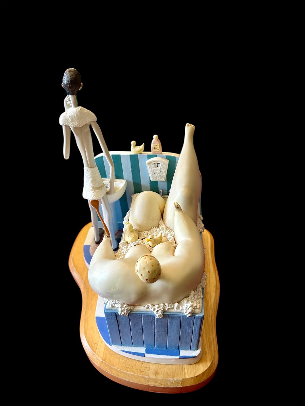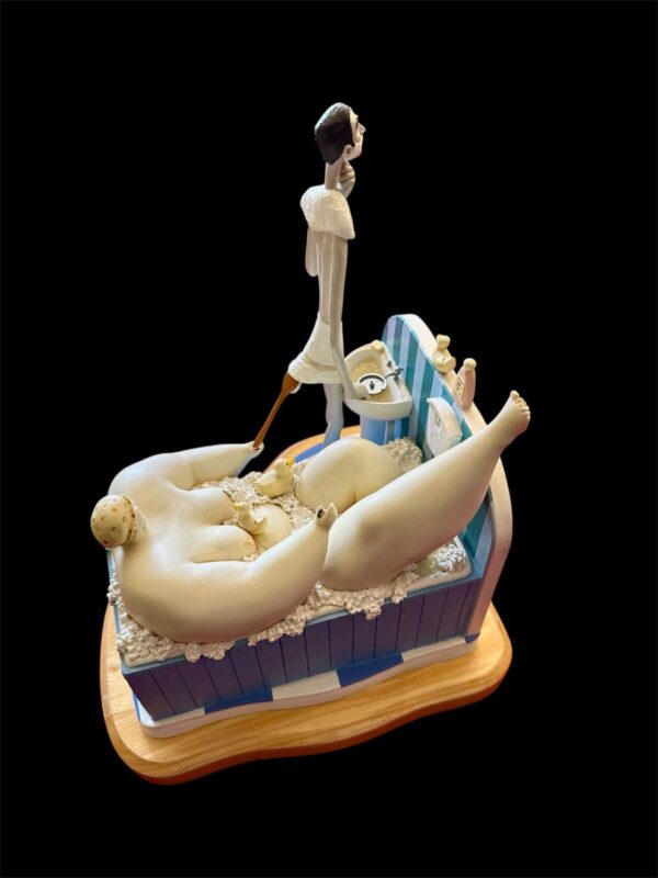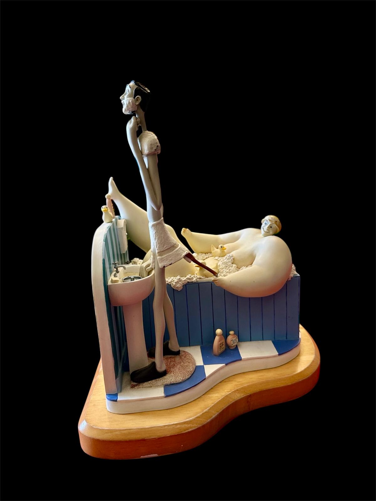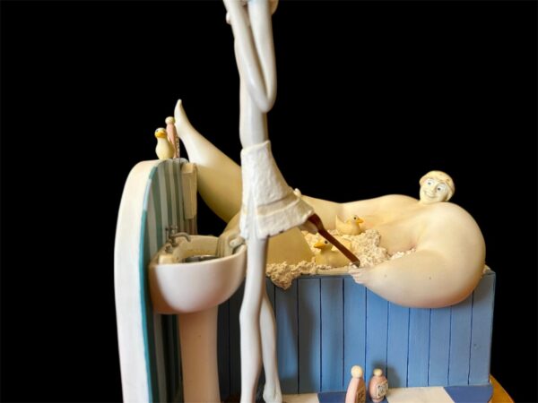 The sculpture features Szikora’s trademark “fat and thin” character pairing: an ultra-lean man focused on his morning shave at a pedestal sink, while a comically large woman enjoys a bubble bath behind him, complete with tiny rubber ducks and miniature bath products.