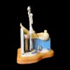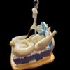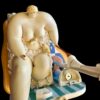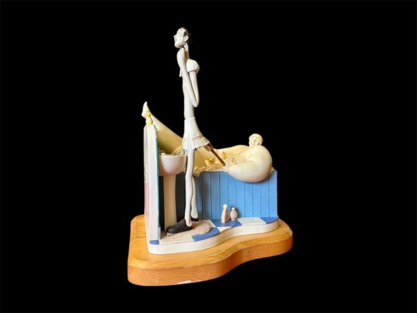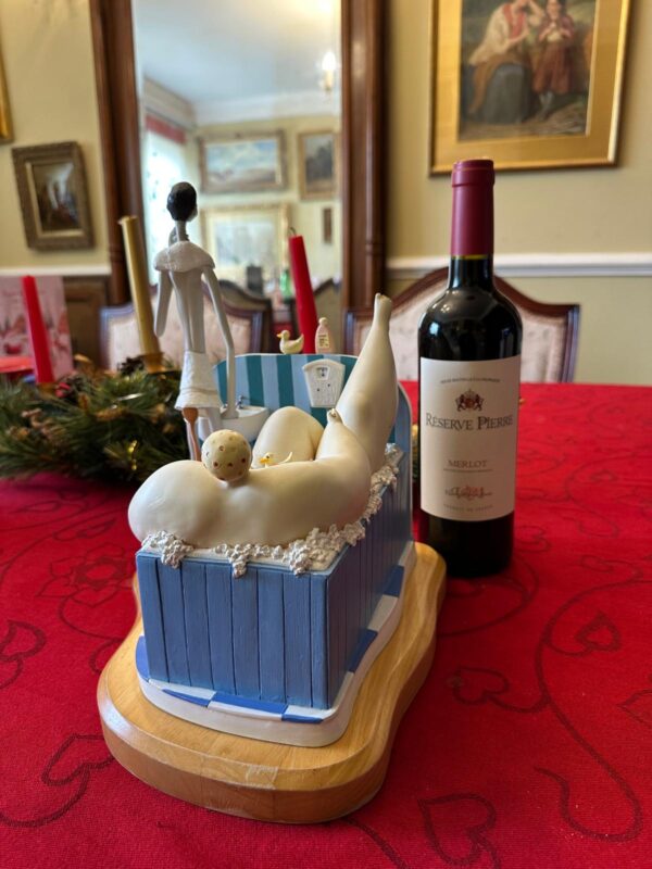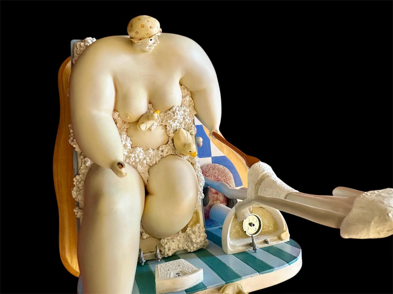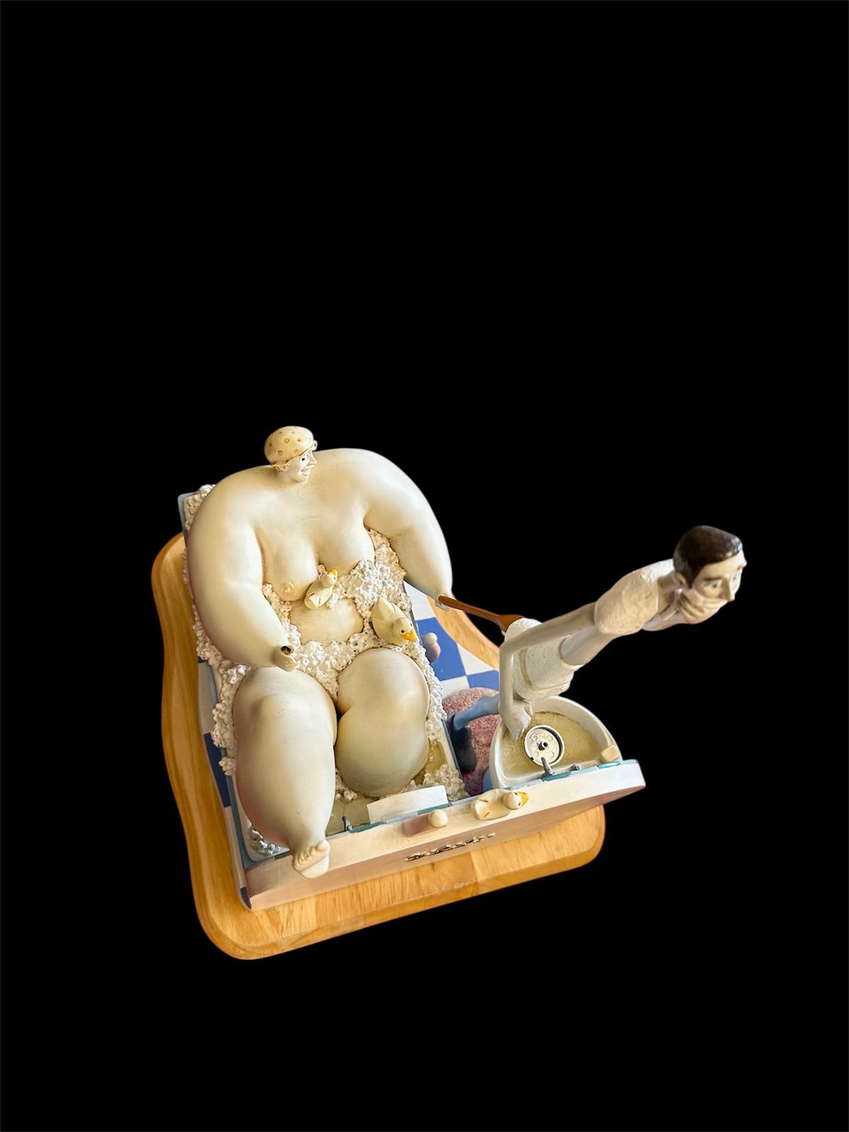 The sculpture features Szikora’s trademark “fat and thin” character pairing: an ultra-lean man focused on his morning shave at a pedestal sink, while a comically large woman enjoys a bubble bath behind him, complete with tiny rubber ducks and miniature bath products.