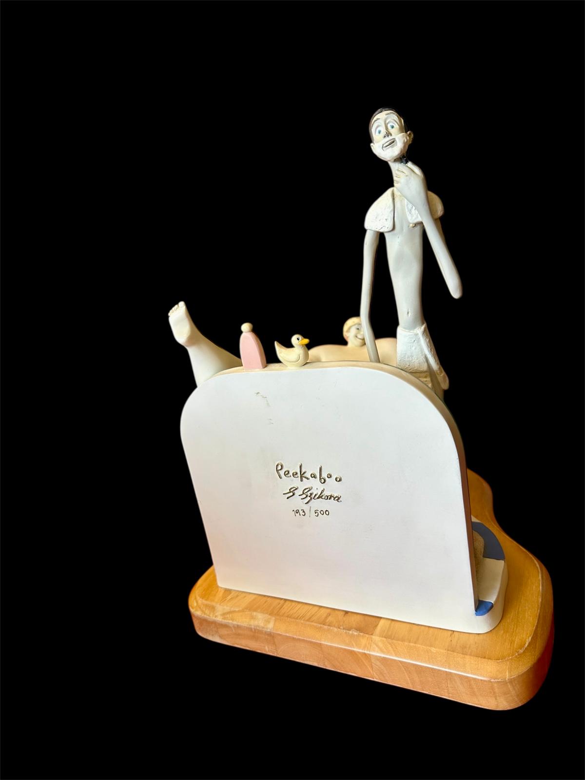 A delightful and whimsical figurative sculpture inspired by the celebrated British artist Sarah Jane Szikora. This piece is a 3D rendition of her famous work entitled “Peekaboo,” known for its light-hearted and cheeky observation of human life.