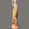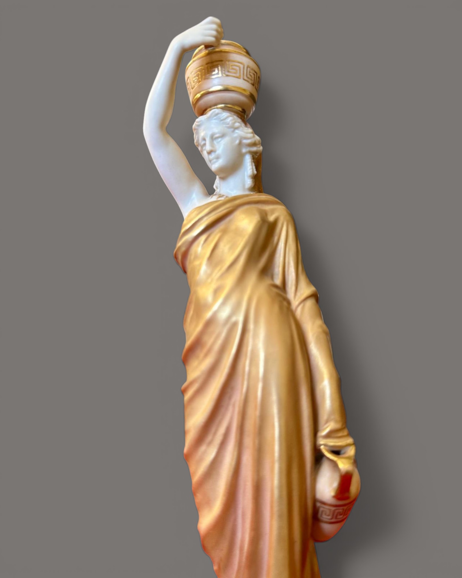 An elegant continental porcelain figure modelled as a classical Greco-Roman maiden carrying amphoriform water vessels, one balanced gracefully upon her head and the other held at her side. The figure is finely executed in bisque and glazed porcelain, with a richly gilded draped garment contrasting against the pale unglazed flesh tones, typical of late 19th to early 20th century classical revival decorative art. The amphorae are ornamented with a Greek key (meander) pattern, reinforcing the neoclassical inspiration. Standing upon a circular base, the sculpture displays refined modelling of drapery, posture, and facial features. Likely produced in continental Europe, possibly Germany or Austria, during the Art Nouveau / Neoclassical revival period. Condition appears very good with light age-related wear consistent with careful display.