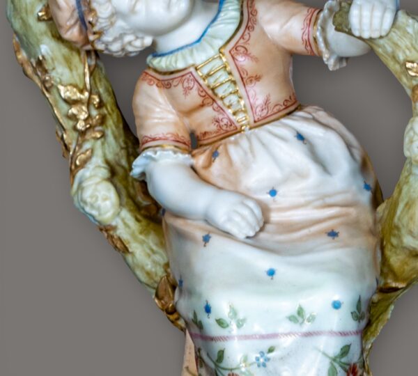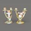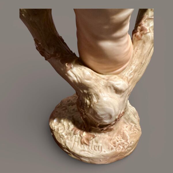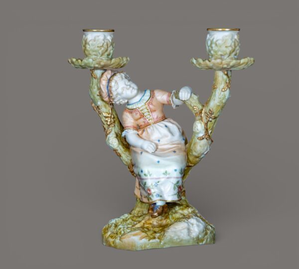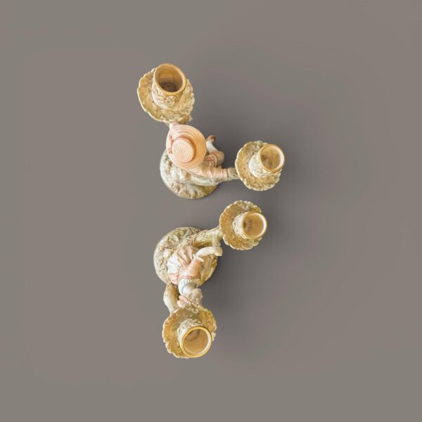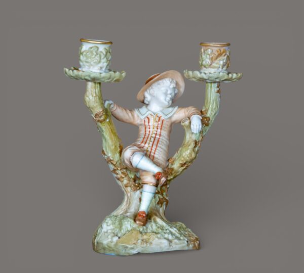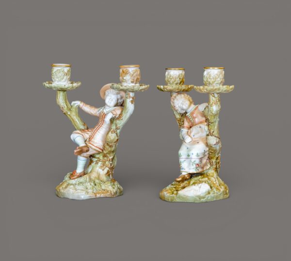 A charming pair of Royal Worcester porcelain figural candlesticks modelled as a seated boy and girl resting within naturalistic branching tree supports, each surmounted by twin candle nozzles formed as floral cups. Executed in softly tinted pastel enamels with gilt accents, the figures wear period costume typical of late Victorian pastoral subjects. The bases are textured to resemble moss-covered ground, while the branching stems display finely modelled bark and applied foliage, demonstrating the high level of craftsmanship associated with Royal Worcester’s decorative wares of the period. Likely dating from the late 19th to early 20th century, these pieces reflect the influence of the Hadley school of modelling, celebrated for its lifelike figural compositions and romantic rural themes. An attractive and decorative pair, ideal for collectors of fine English porcelain or period interior display.