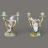 A charming pair of Royal Worcester porcelain figural candlesticks modelled as a seated boy and girl resting within naturalistic branching tree supports, each surmounted by twin candle nozzles formed as floral cups.