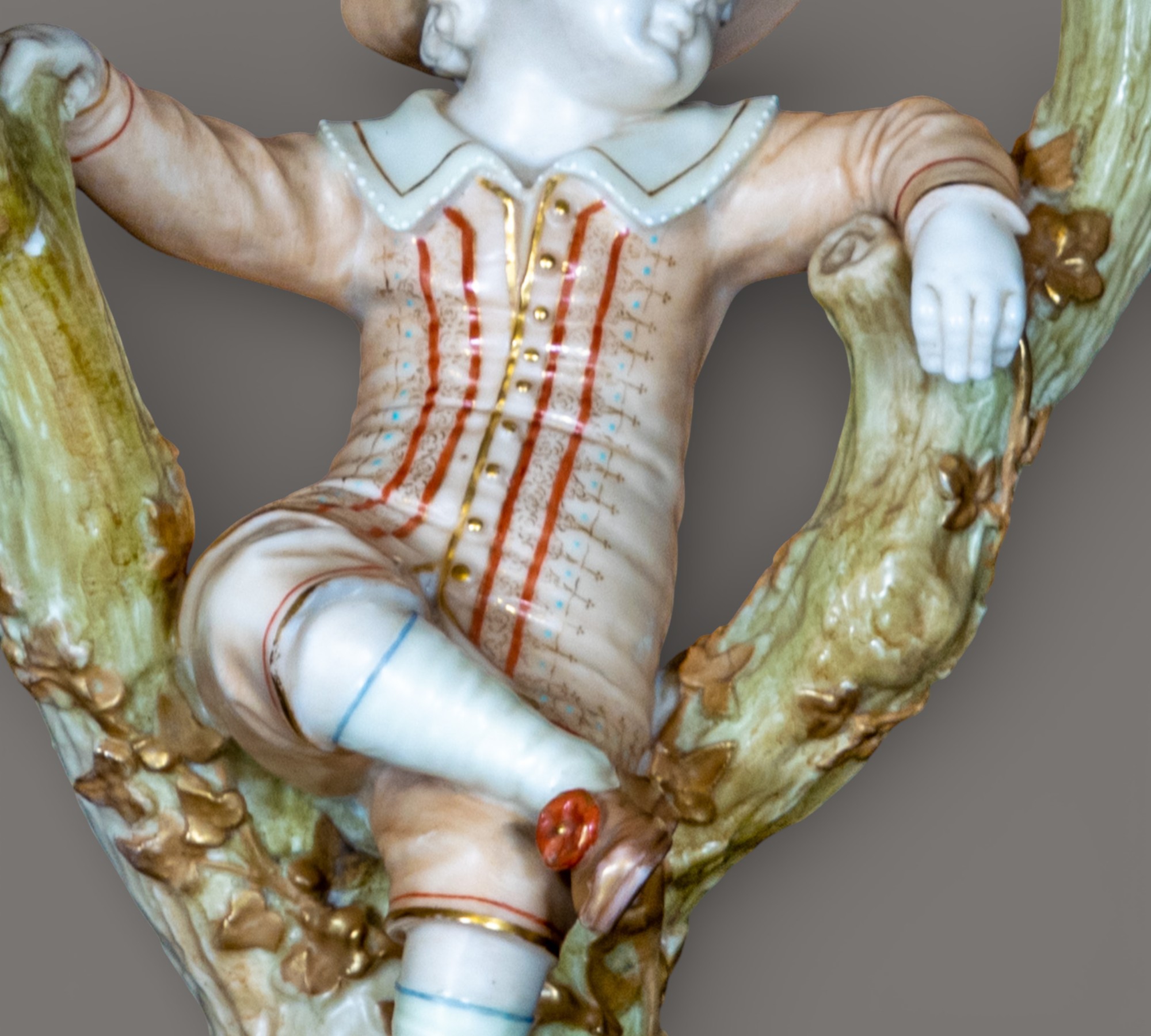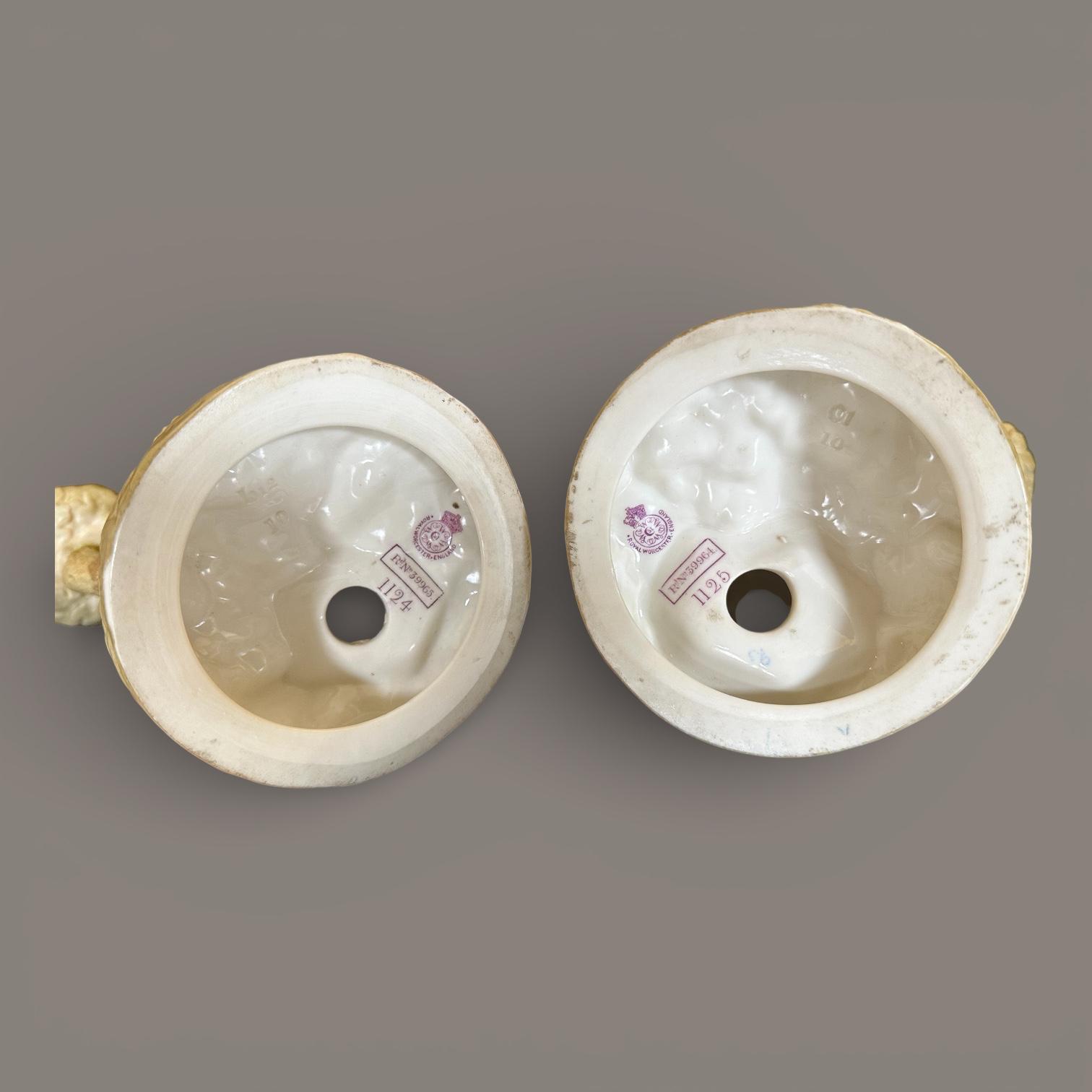 A charming pair of Royal Worcester porcelain figural candlesticks modelled as a seated boy and girl resting within naturalistic branching tree supports, each surmounted by twin candle nozzles formed as floral cups.