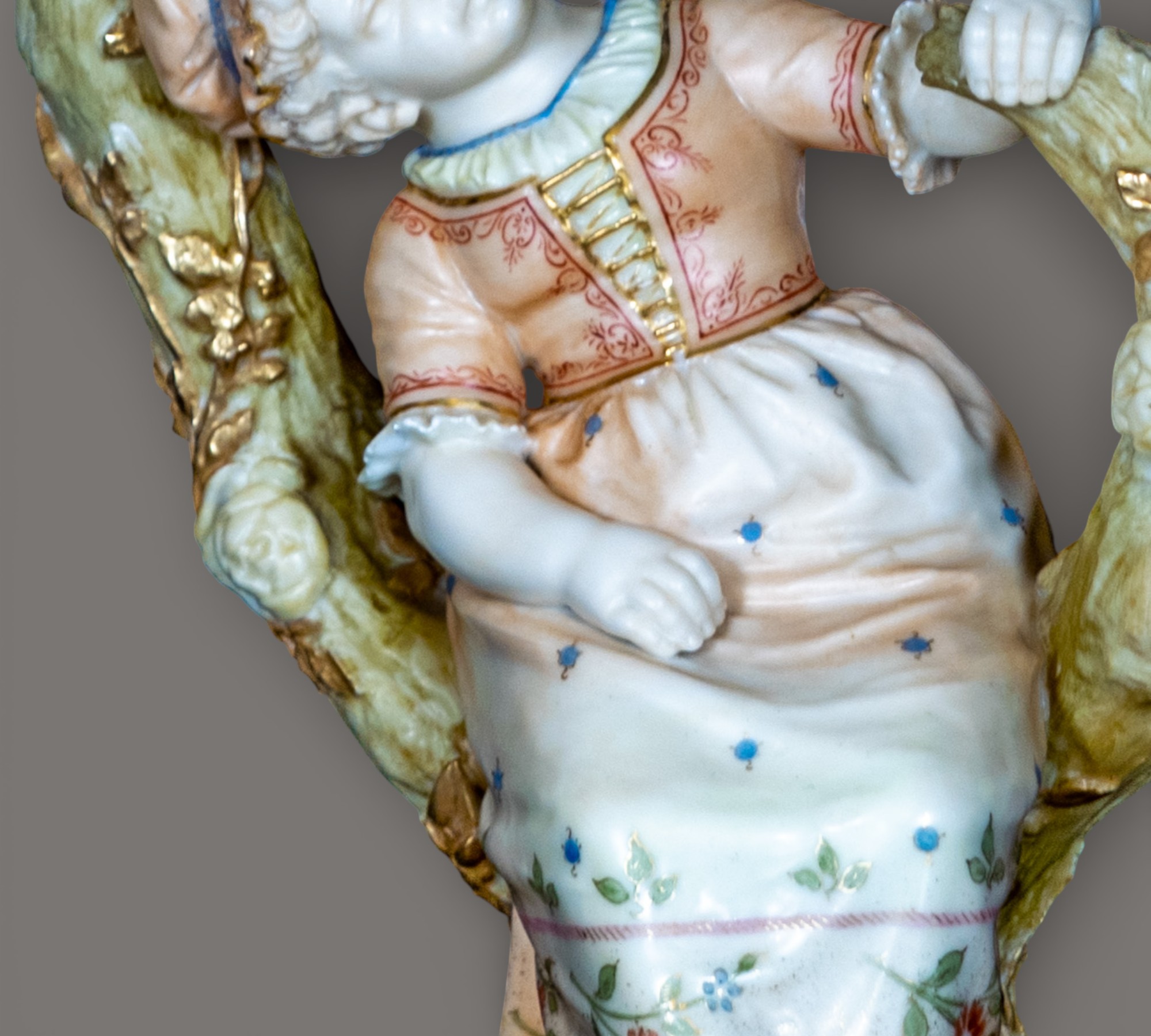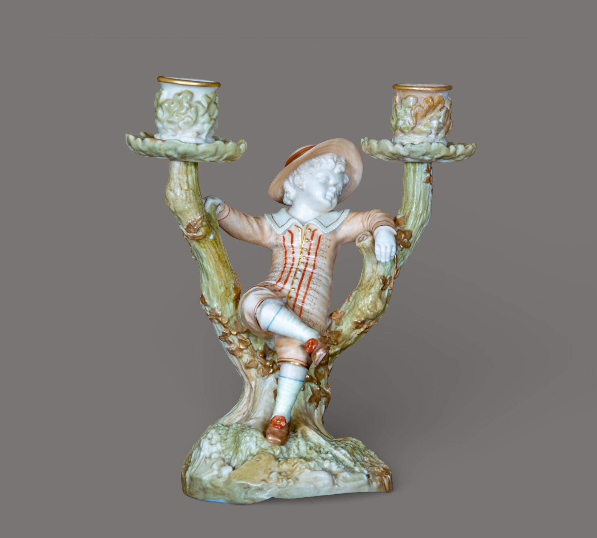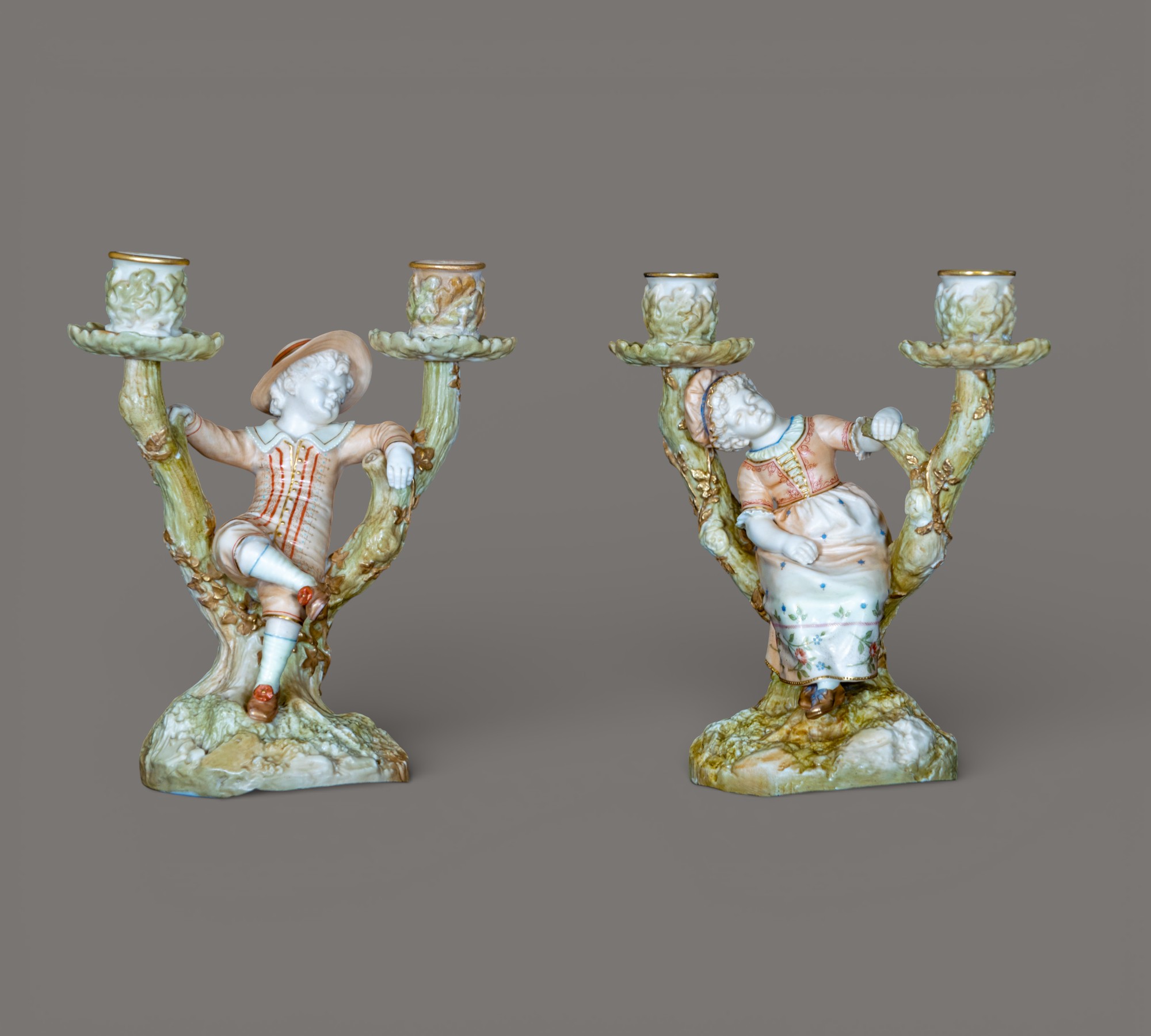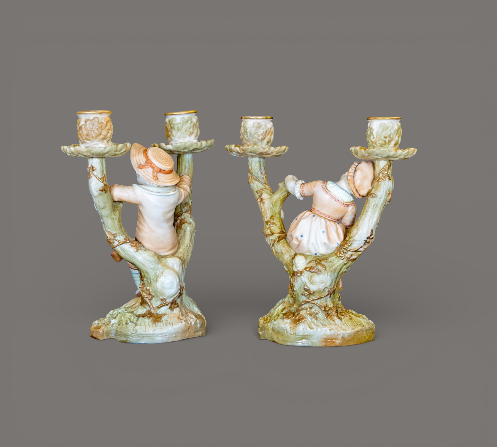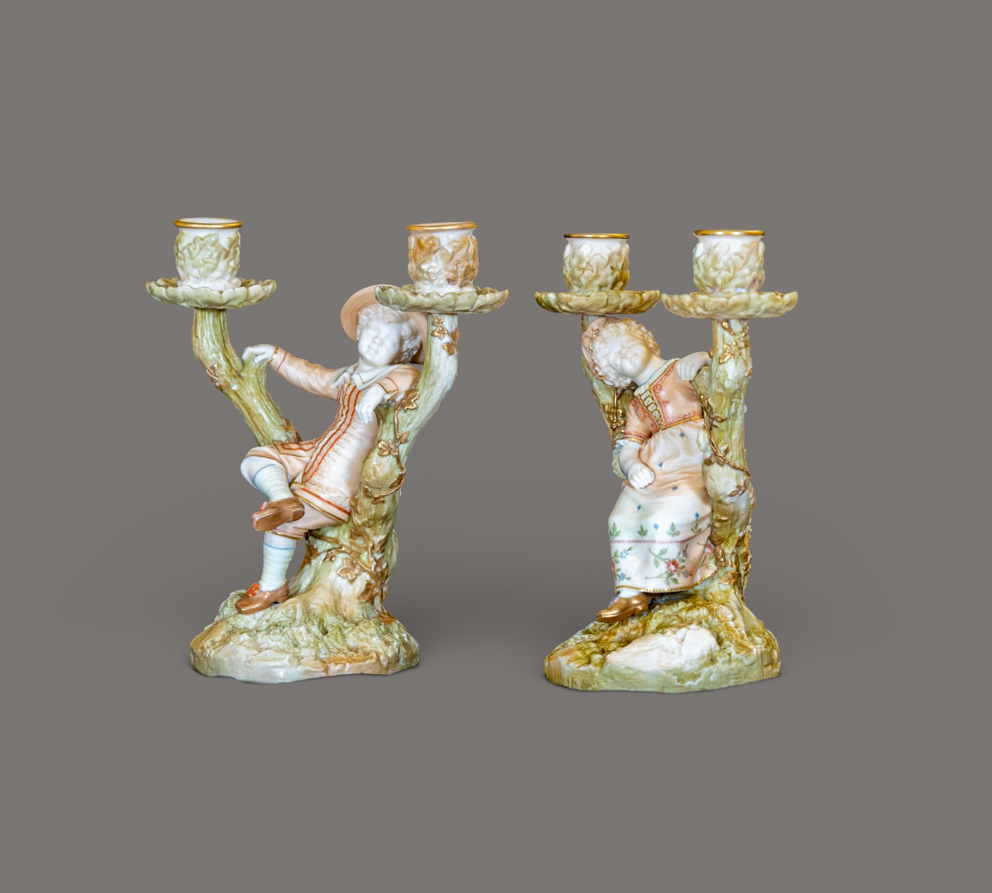 Pair of Royal Worcester Figural Porcelain Candlesticks, Boy and Girl in Tree Form, Late 19th Century