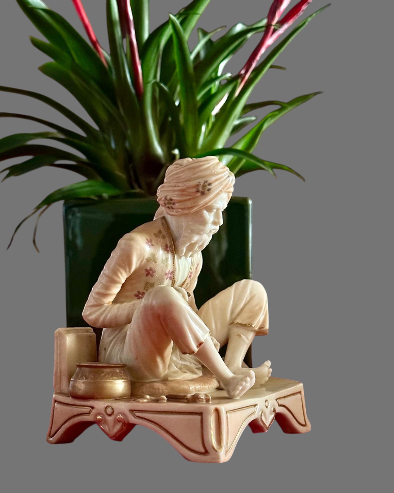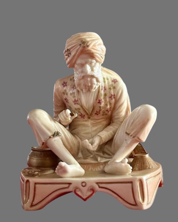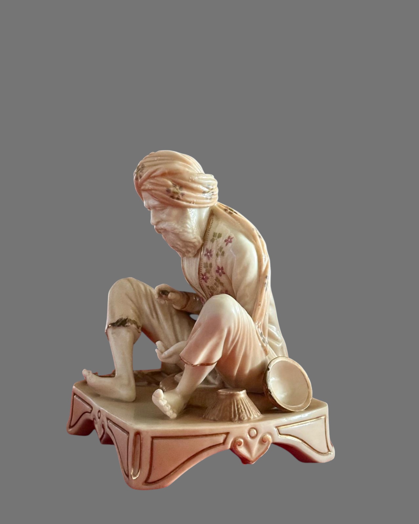 This finely modelled Royal Worcester porcelain figure represents Karan Singh, The Copper Beater, a traditional Indian artisan depicted seated cross-legged at his work. The figure was possibly by James Hadley, one of Royal Worcester’s most celebrated modellers, known for his highly expressive and finely detailed sculptural designs.