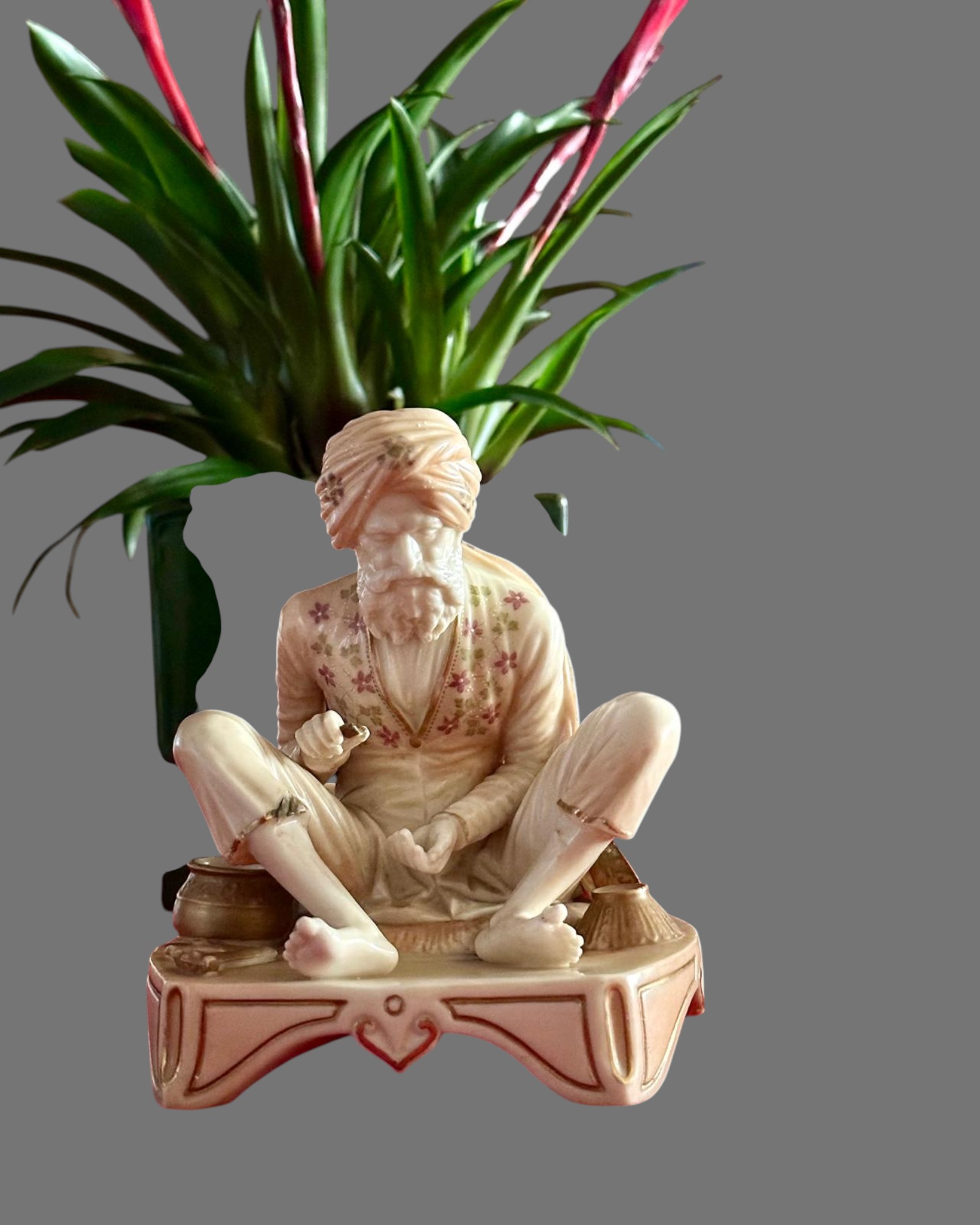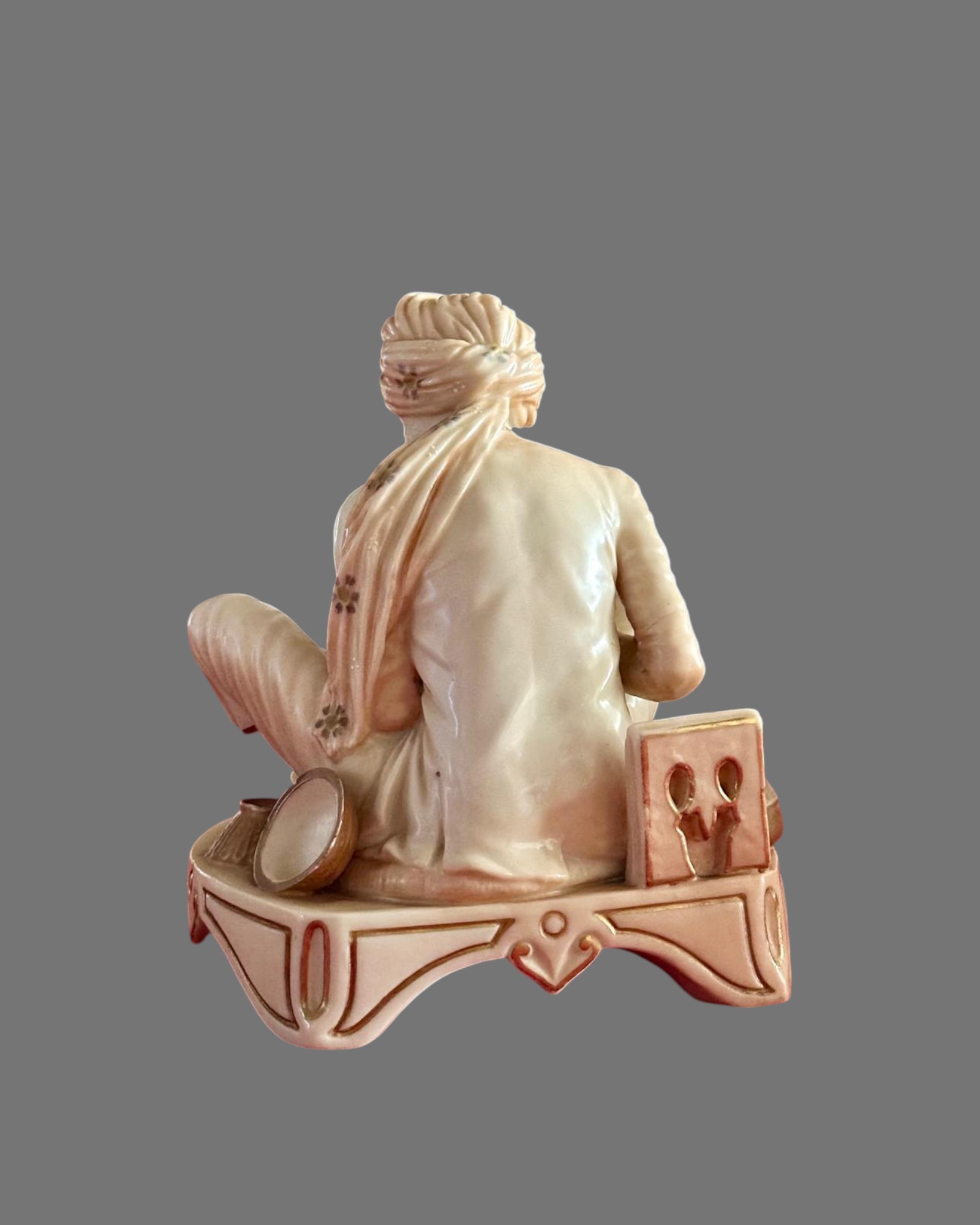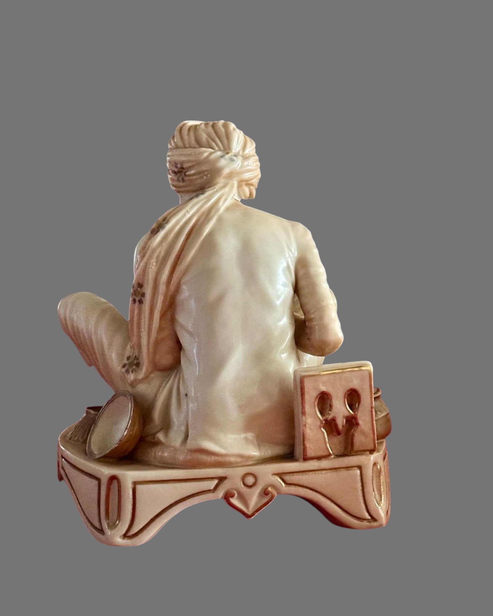 This finely modelled Royal Worcester porcelain figure represents Karan Singh, The Copper Beater, a traditional Indian artisan depicted seated cross-legged at his work. The figure was possibly by James Hadley, one of Royal Worcester’s most celebrated modellers, known for his highly expressive and finely detailed sculptural designs.
