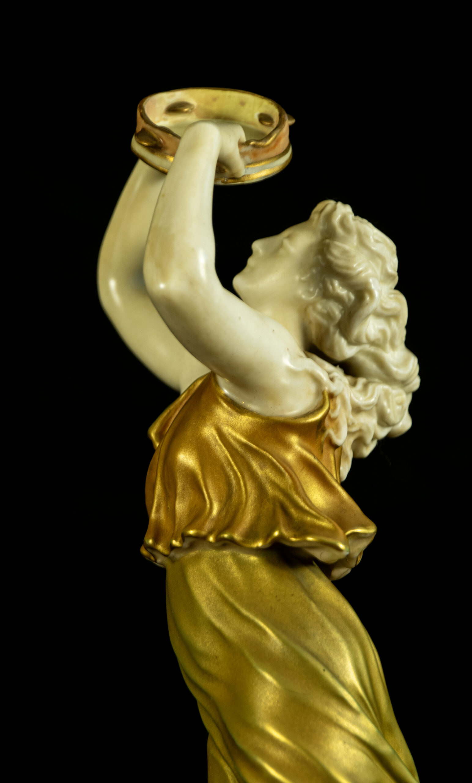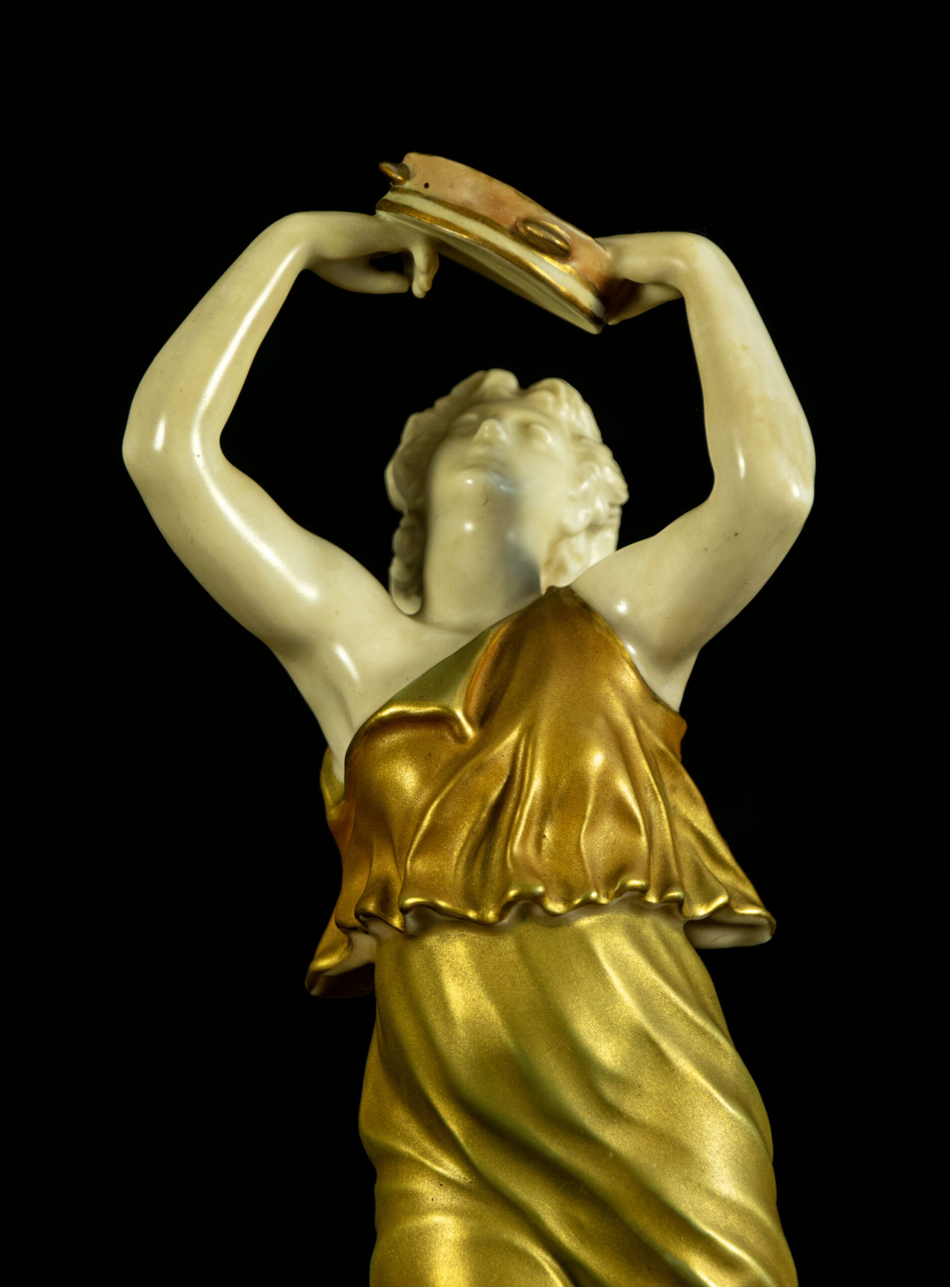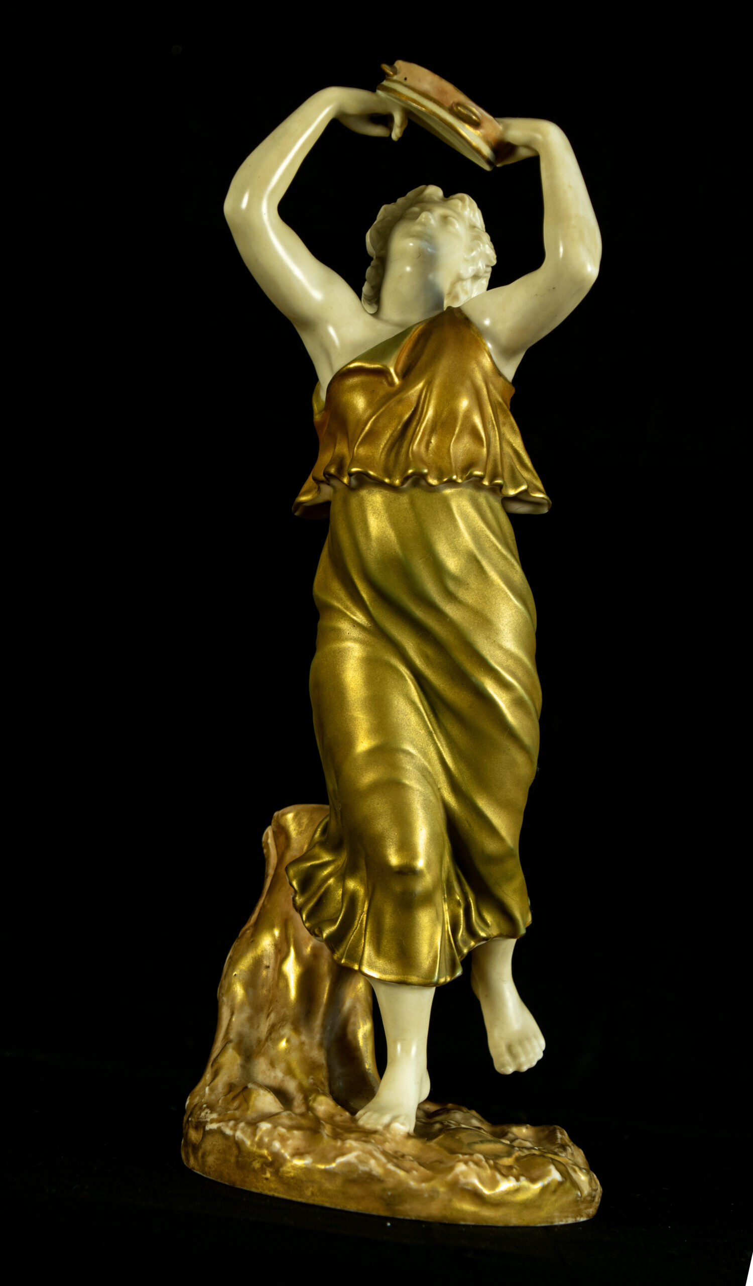 An elegant Royal Worcester porcelain figure, model number 1441, finely modelled by the distinguished sculptor James Hadley, dating to the late 19th / early 20th century. The figure stands approximately 26 cm tall and is finished in a rich and luminous gilt glaze, characteristic of Royal Worcester’s finest decorative wares.